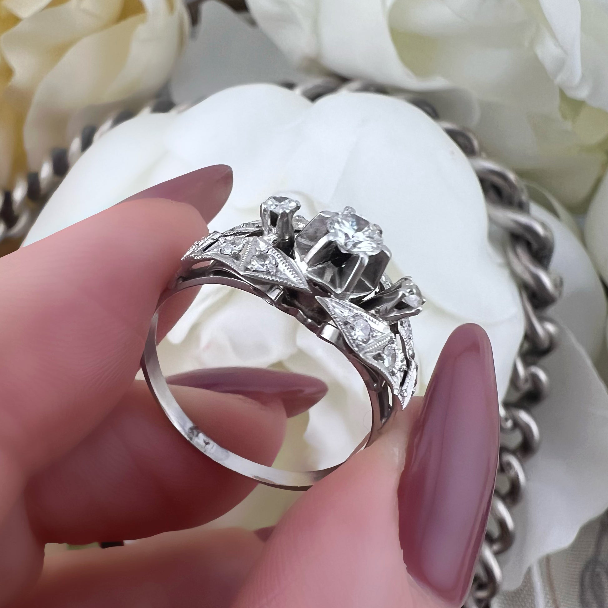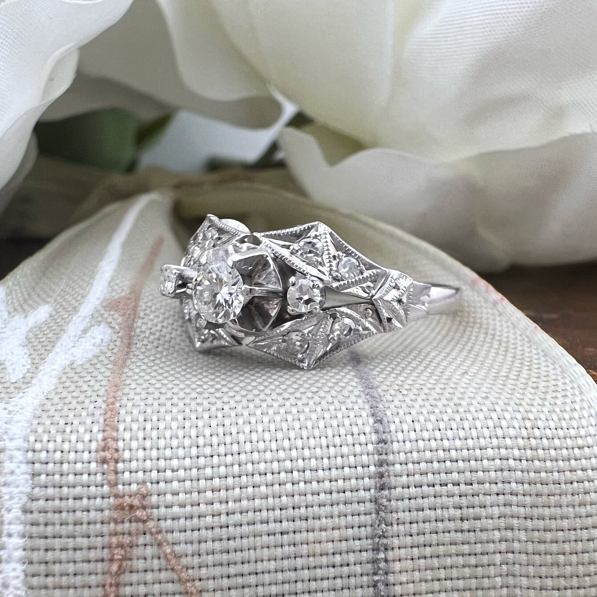 Un raffinato engagement ring Art Déco in platino, esempio autentico della gioielleria degli anni ’20, caratterizzato da linee geometriche e dettagli eleganti.