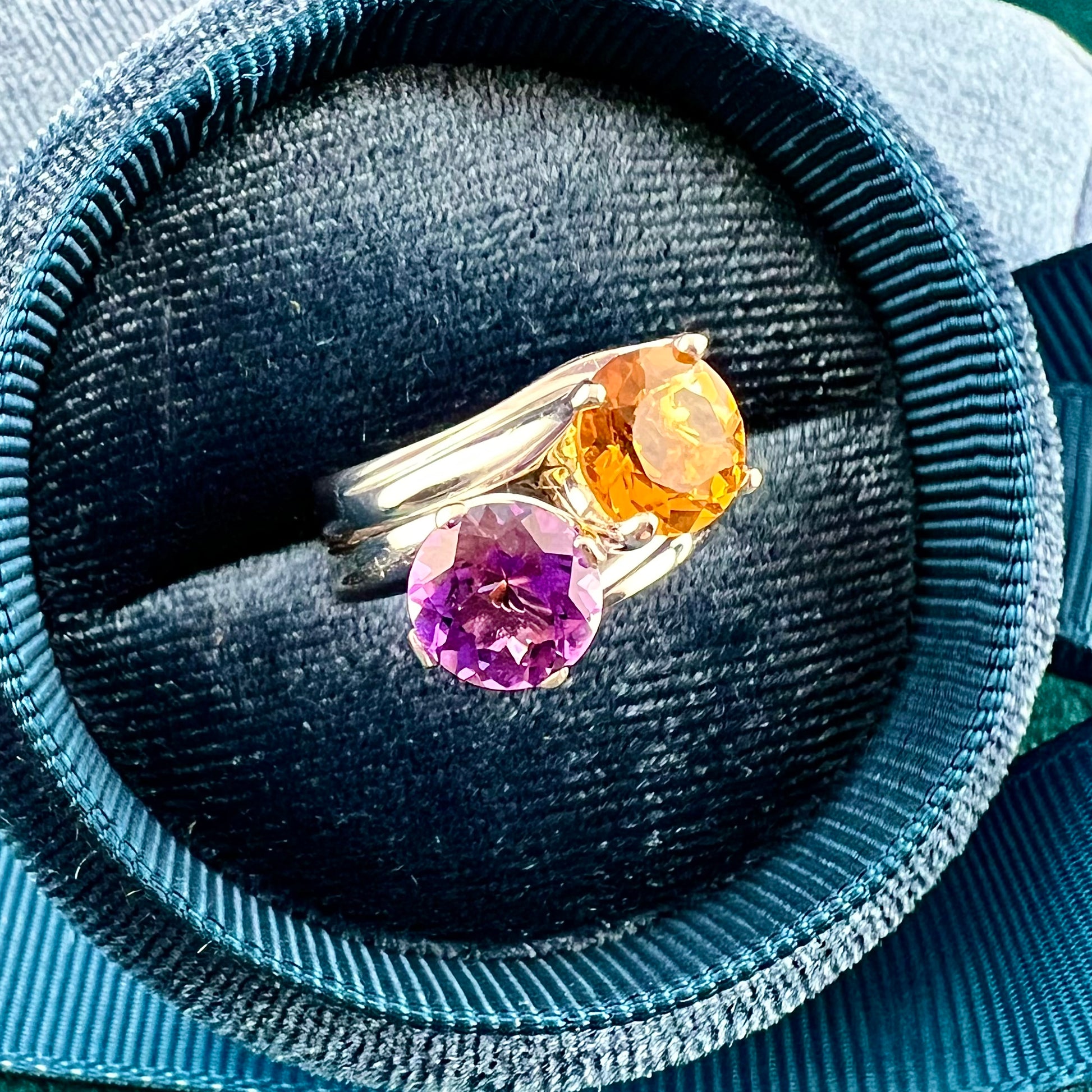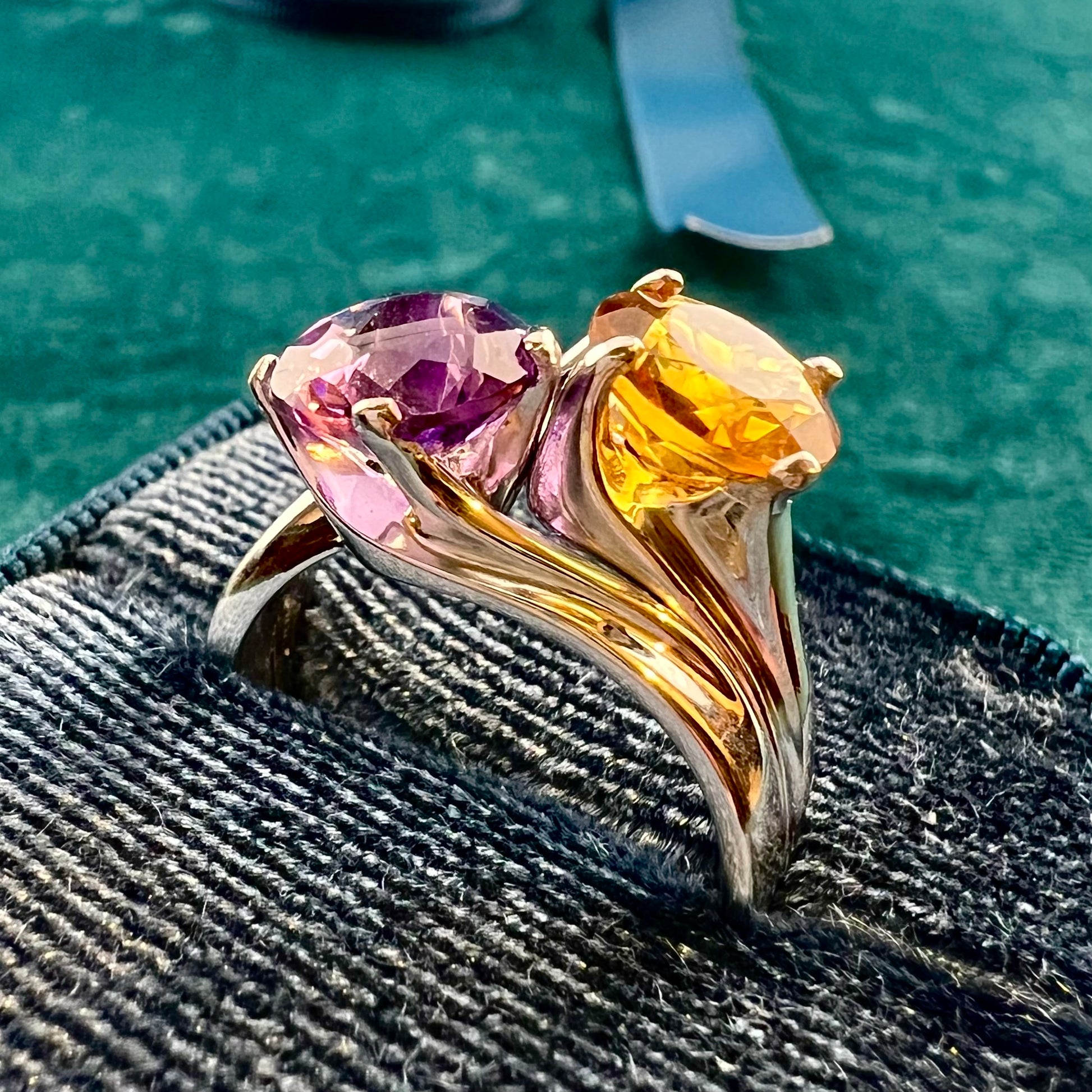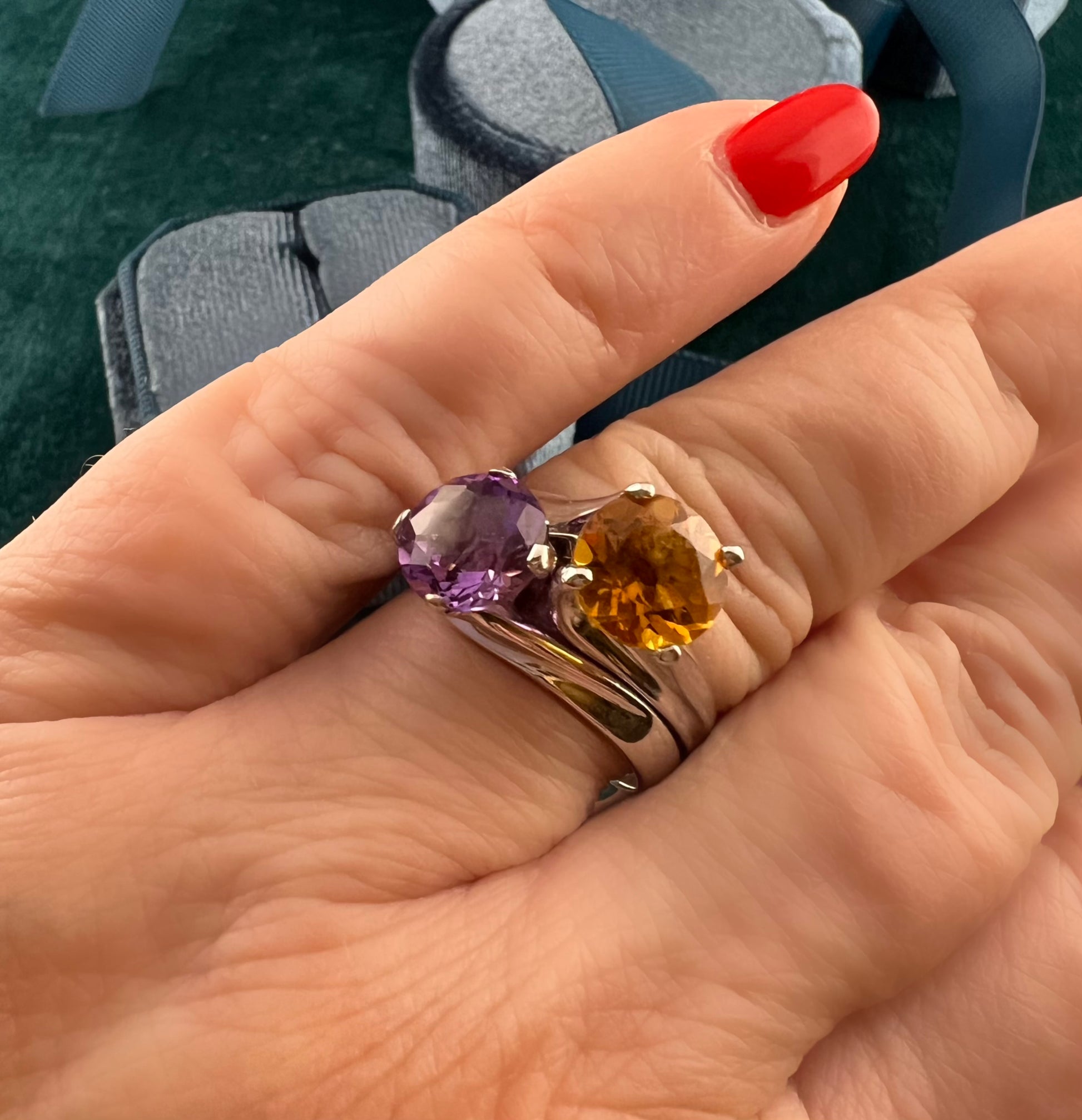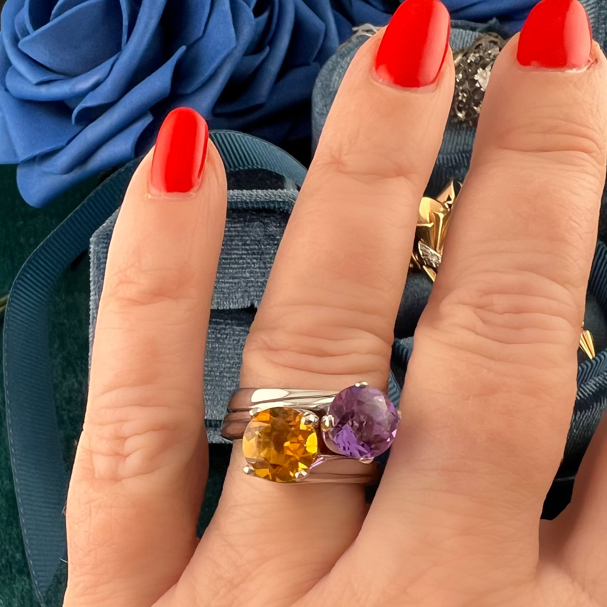 Imponente e fascinoso anello toi et moi realizzato in oro bianco 18 carati con robusta montatura doppia. Sono fissate con griffe due luminose pietre di colore a taglio tondo. Un’ametista ed un citrino dai colori intensi ed incantevoli da mm 8 ciascuna. Realizzato in Italia negli anni ‘60-‘70 del ‘900.