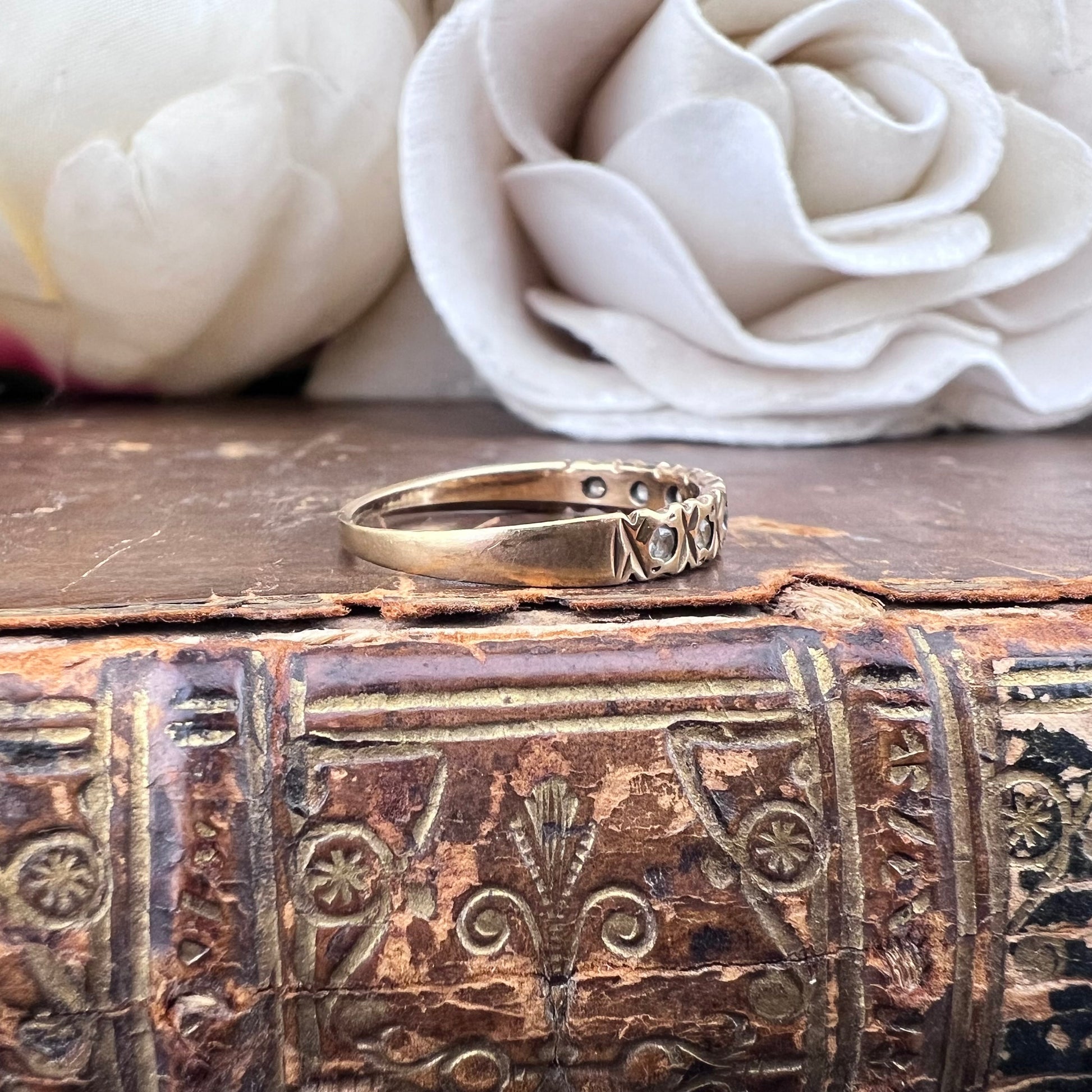 Questo anello vintage di Birmingham del 1976 è un’elegante testimonianza del design ornato degli anni ’70. Il modello presenta una fascia in oro giallo a titolo 9 carati, caratterizzata da un motivo geometrico intrecciato che conferisce un aspetto sofisticato e unico. Lungo la banda sono incastonati sei quarzi trasparenti, tagliati a forma di rosa, che catturano la luce con un bagliore delicato, aggiungendo un tocco di raffinatezza. La finitura leggermente usata, tipica dei gioielli vintage, ne esalta il fascino retrò, rendendolo perfetto per chi apprezza pezzi con storia.