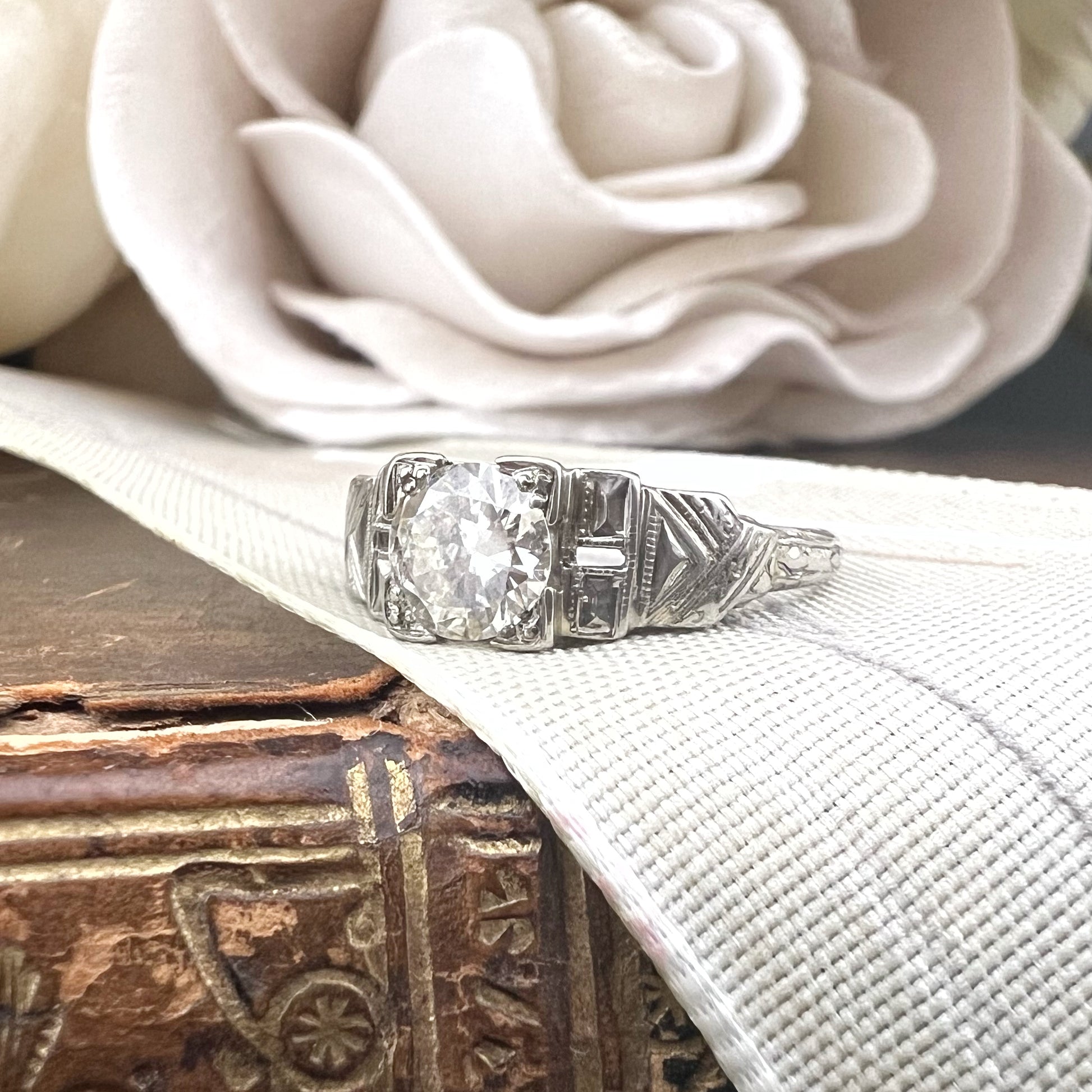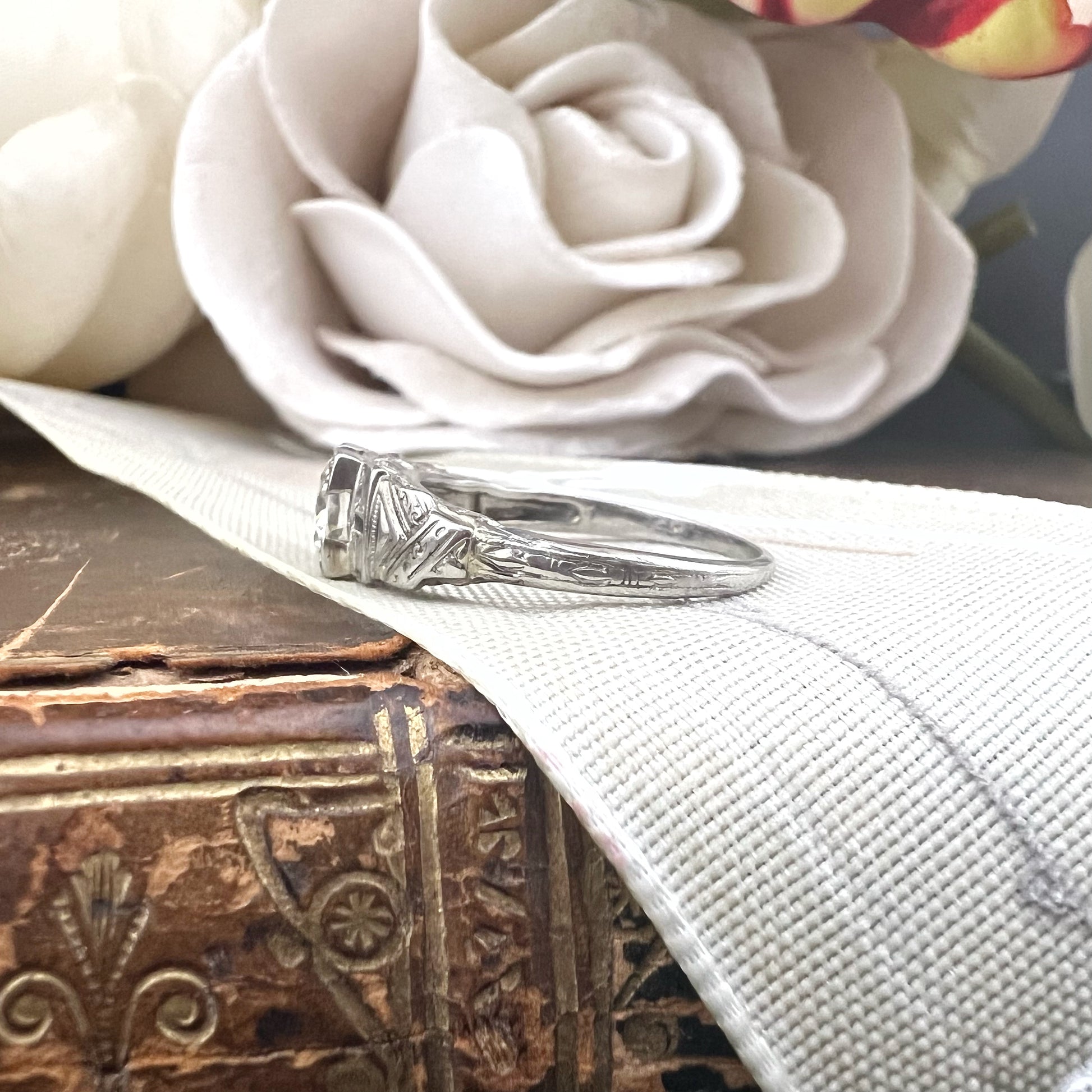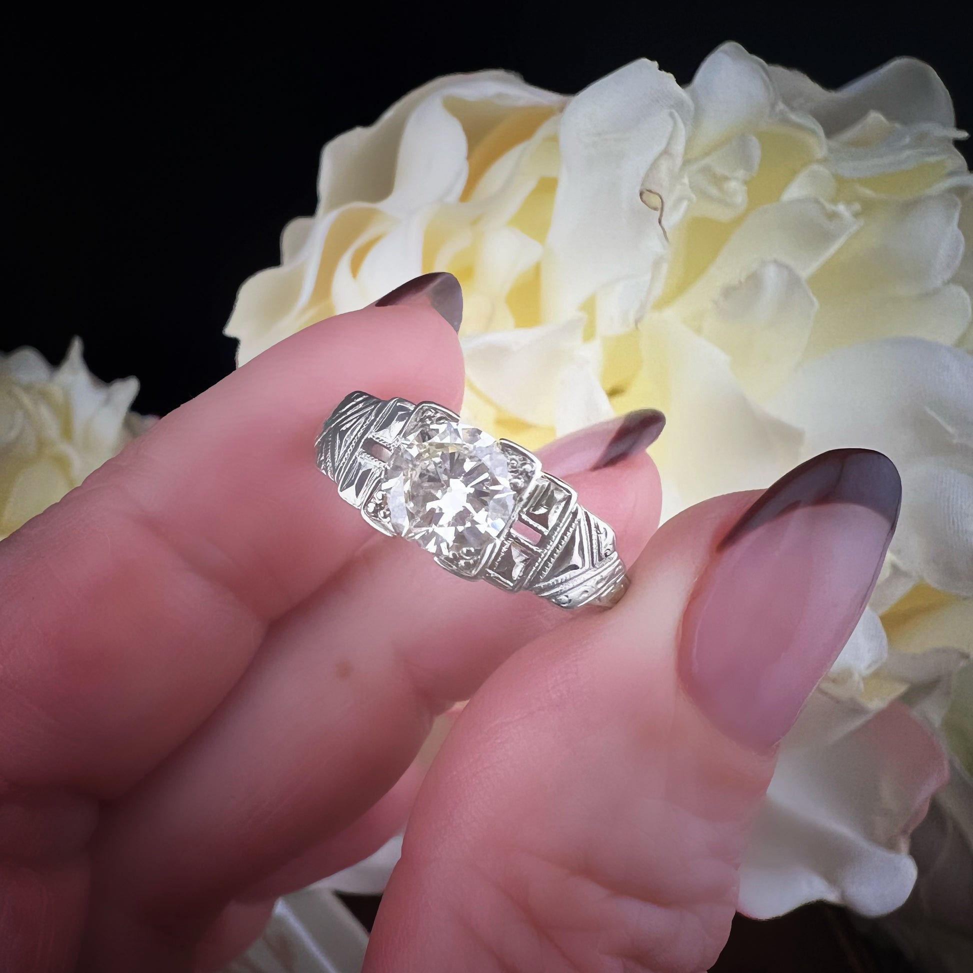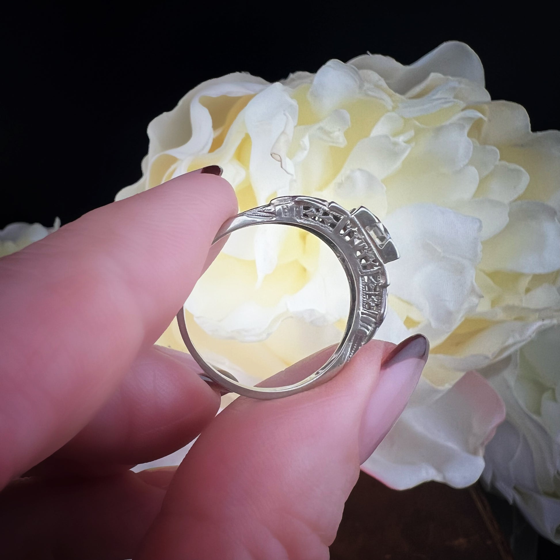 Anello solitario Art Déco in oro bianco 18 ct con diamante old mine cut