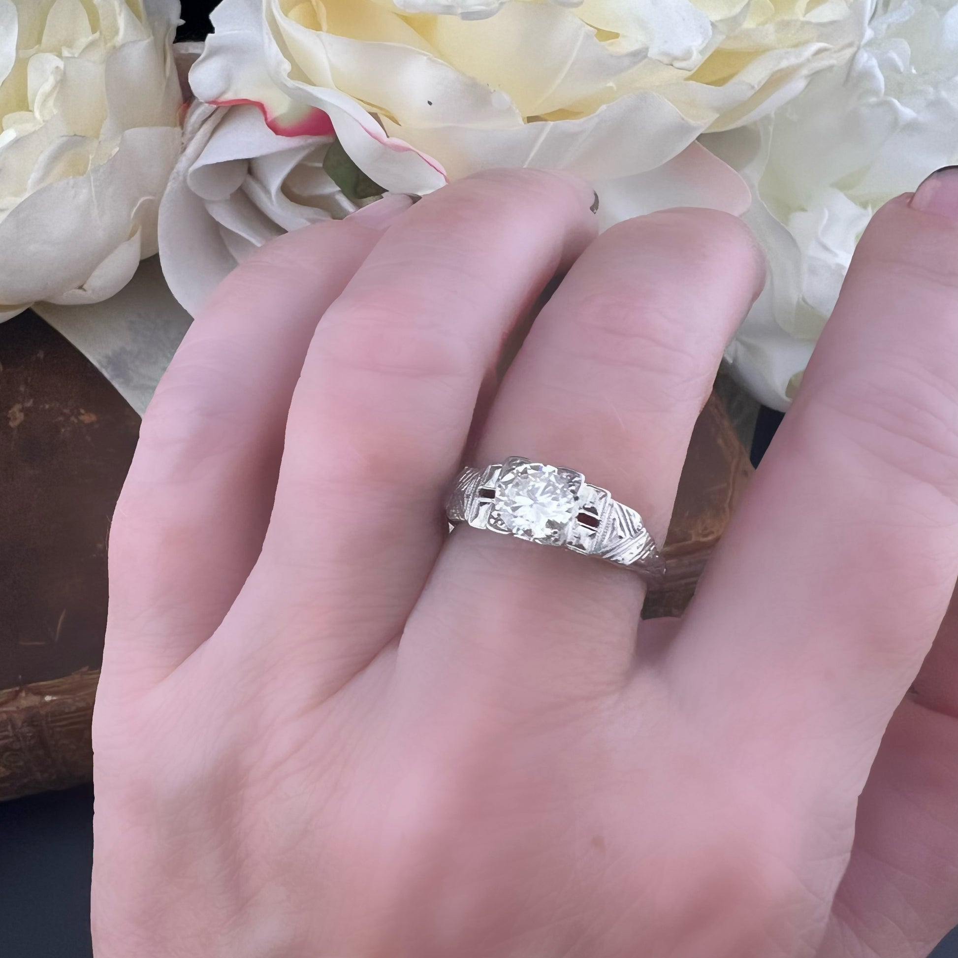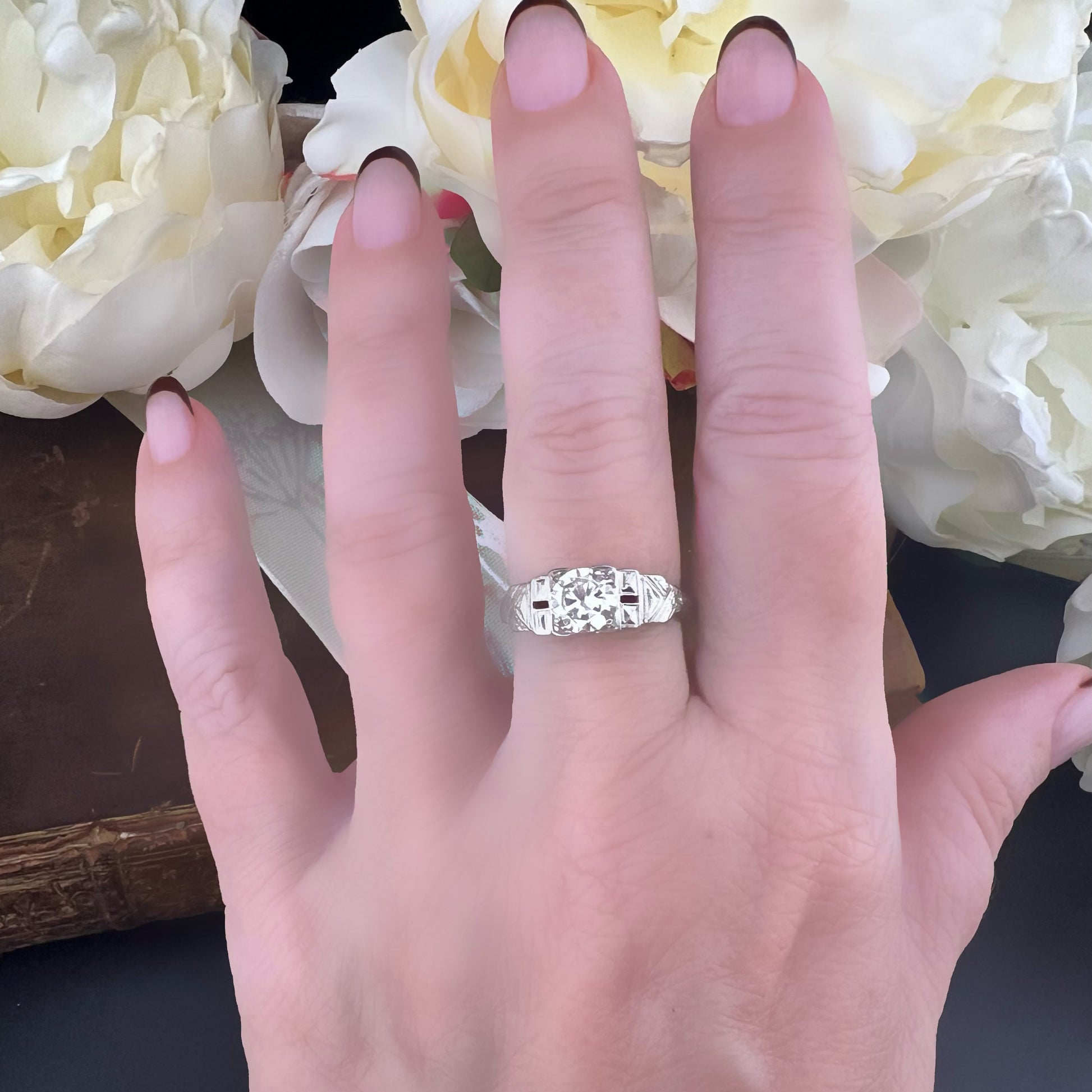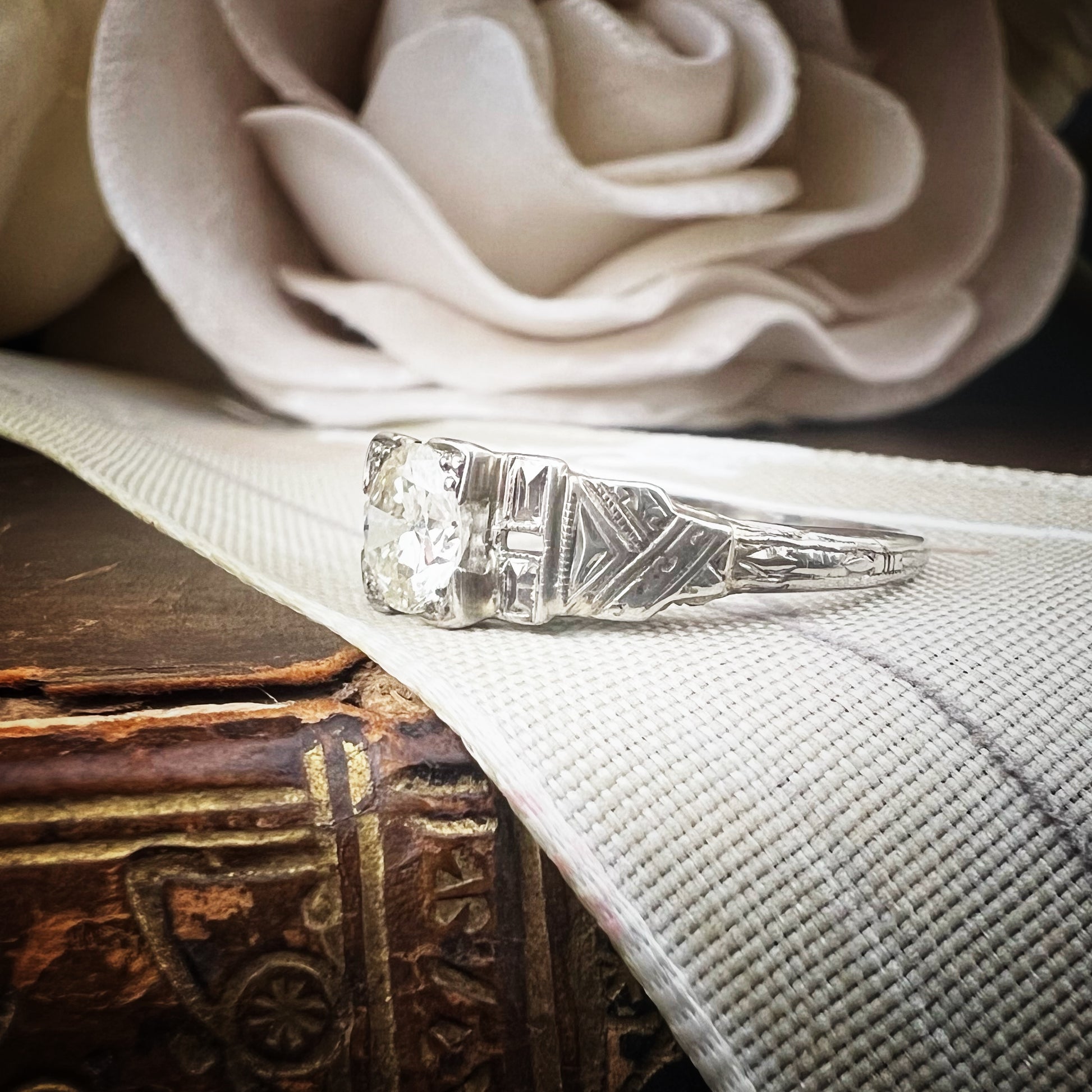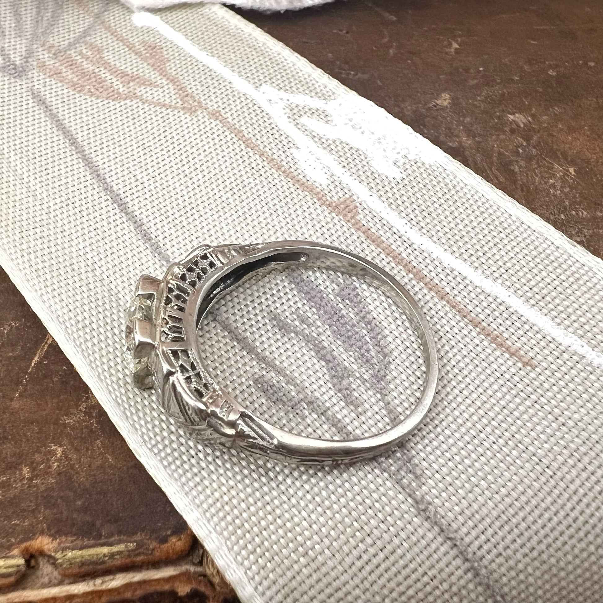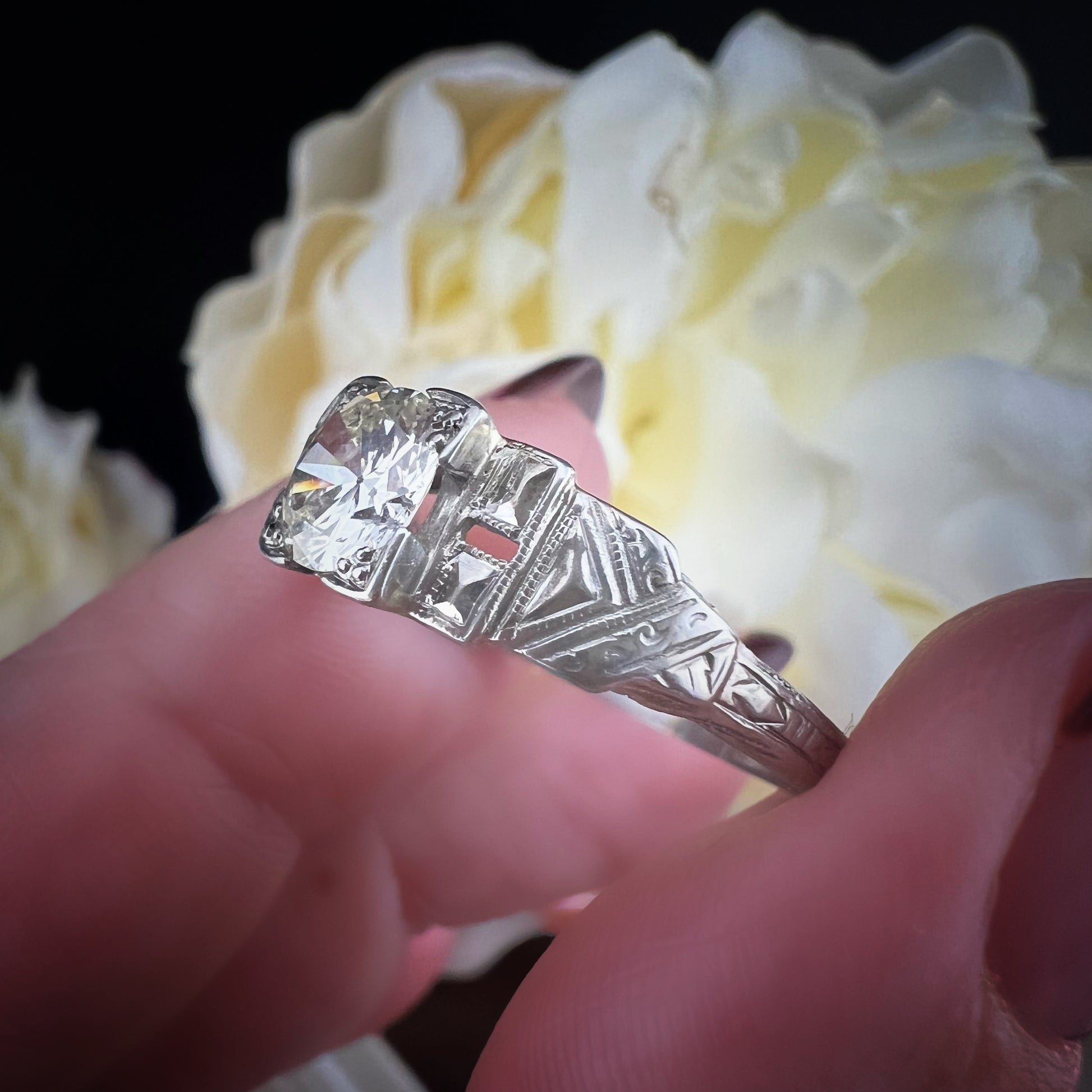 Anello solitario Art Déco in oro bianco 18 ct con diamante old mine cut