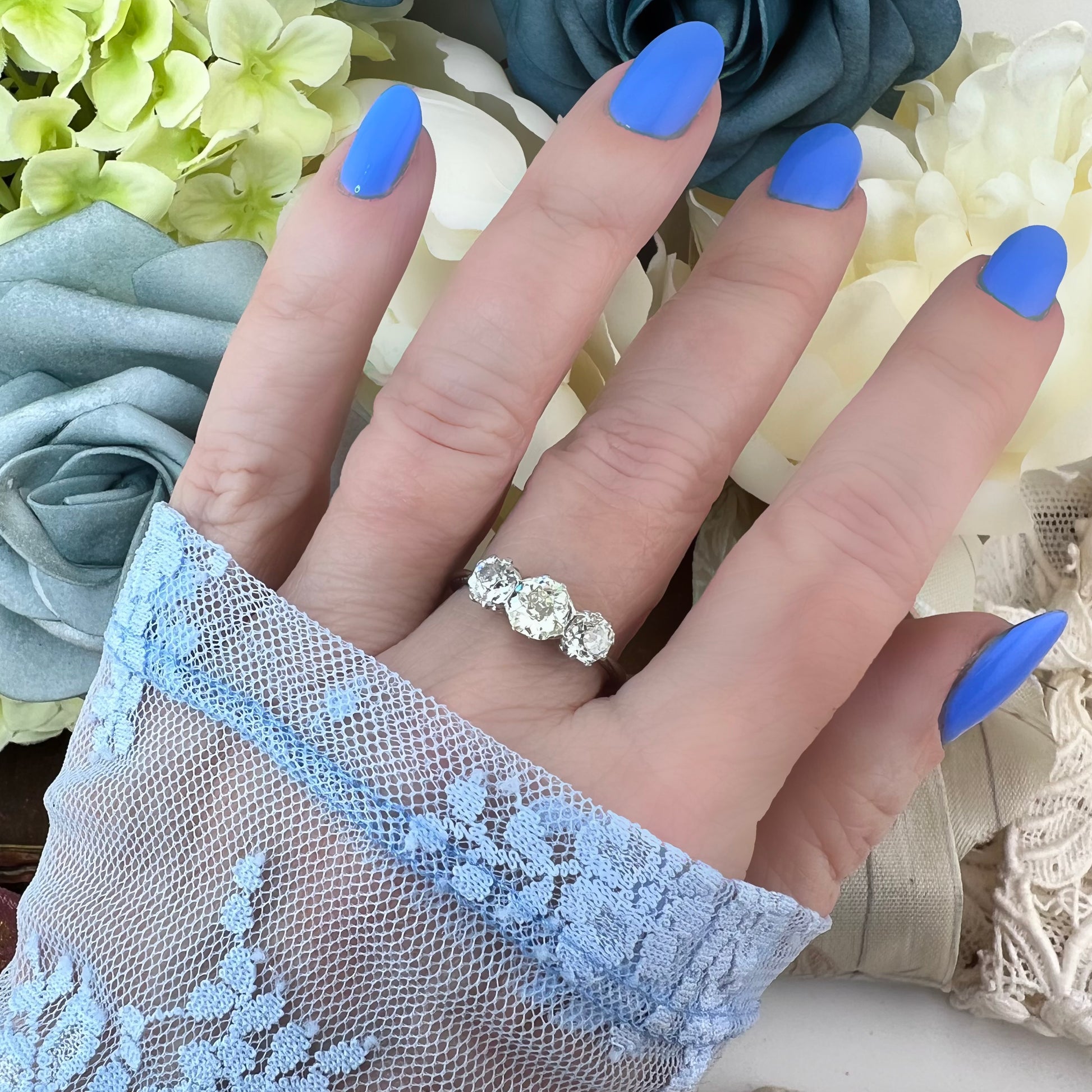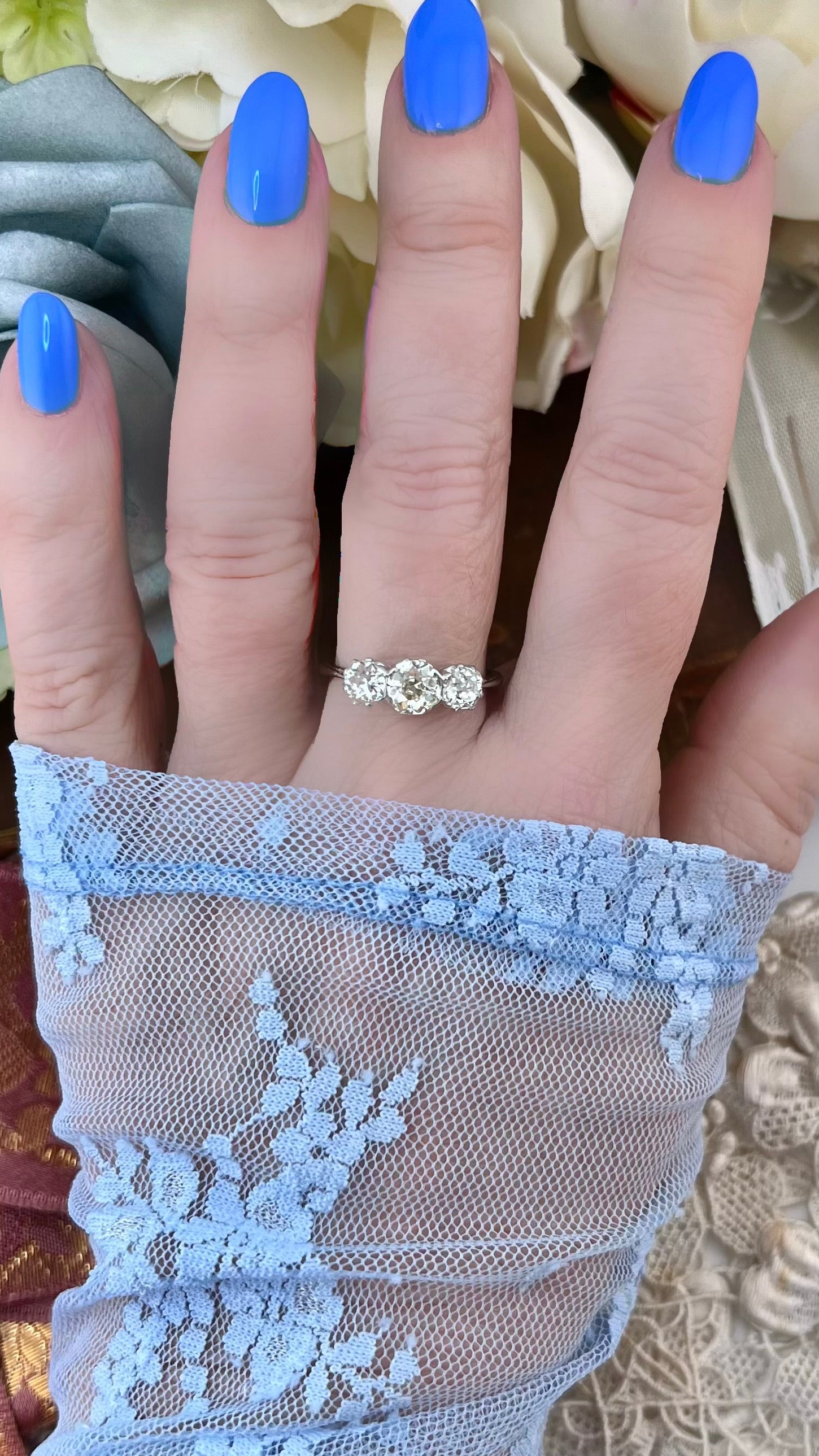 Acquistare questo anello significa scegliere un gioiello antico autentico, capace di unire rarità, eleganza e qualità artigianale. Non si tratta soltanto di un trilogy con tre diamanti antichi di grande fascino, ma di un esemplare che si distingue per dettagli costruttivi inconsueti: il gambo che si apre e si appiattisce vicino ai castoni, la sottile incisione manuale, i cestelli a incrocio e l’armonia cromatica delle tre pietre.