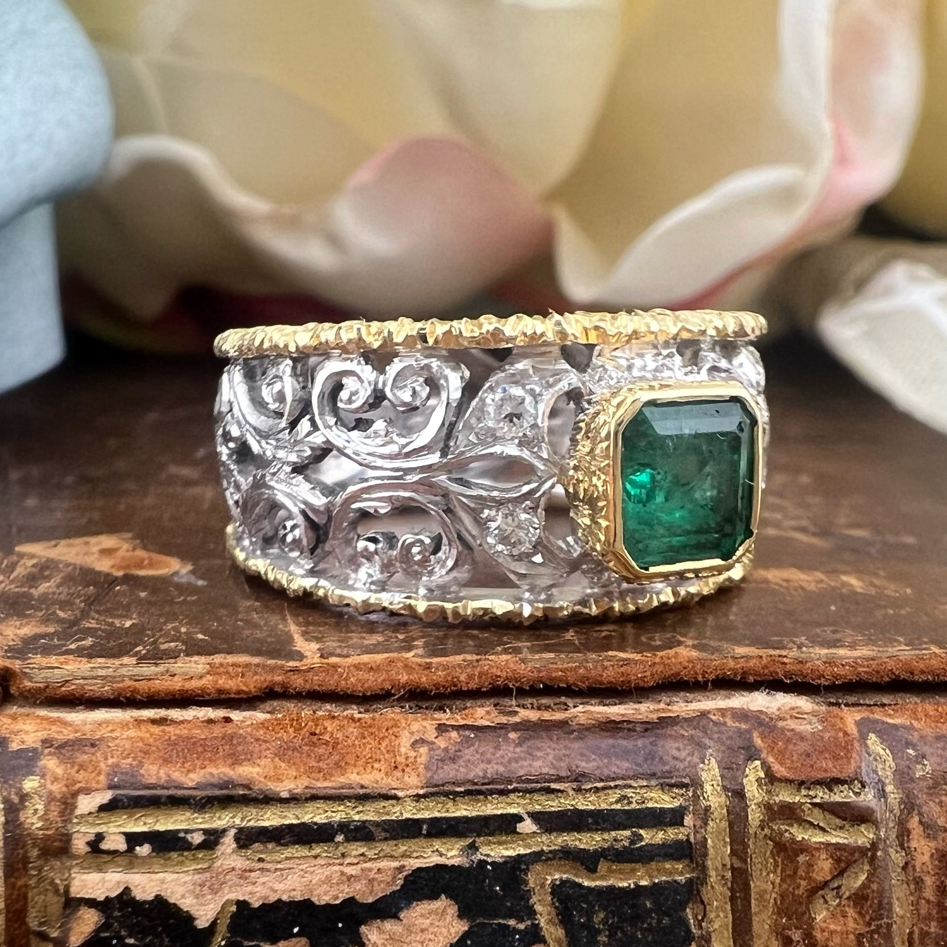 Anello vintage a fascia traforata in oro 18 carati con smeraldo e diamanti