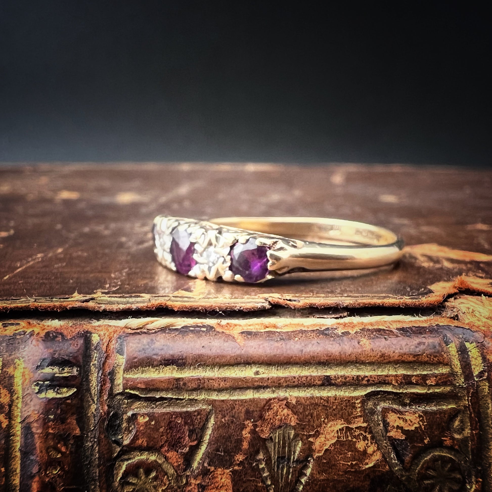 Un gioiello affascinante dal carattere vintage, questo anello degli anni ‘70, proveniente da Londra, cattura l’attenzione grazie alla sua raffinata montatura a ponte cesellata. Il motivo decorativo è impreziosito da eleganti riccioli, che incorniciano armoniosamente le gemme centrali.