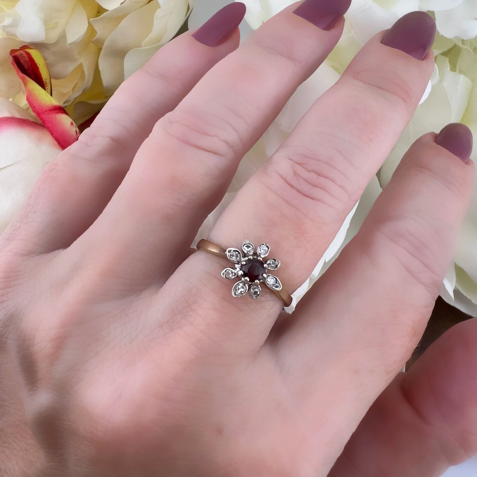 Un gioiello che unisce eleganza e originalità: questo anello vintage presenta una corolla luminosa che si apre attorno a un granato centrale dal colore intenso e profondo.
