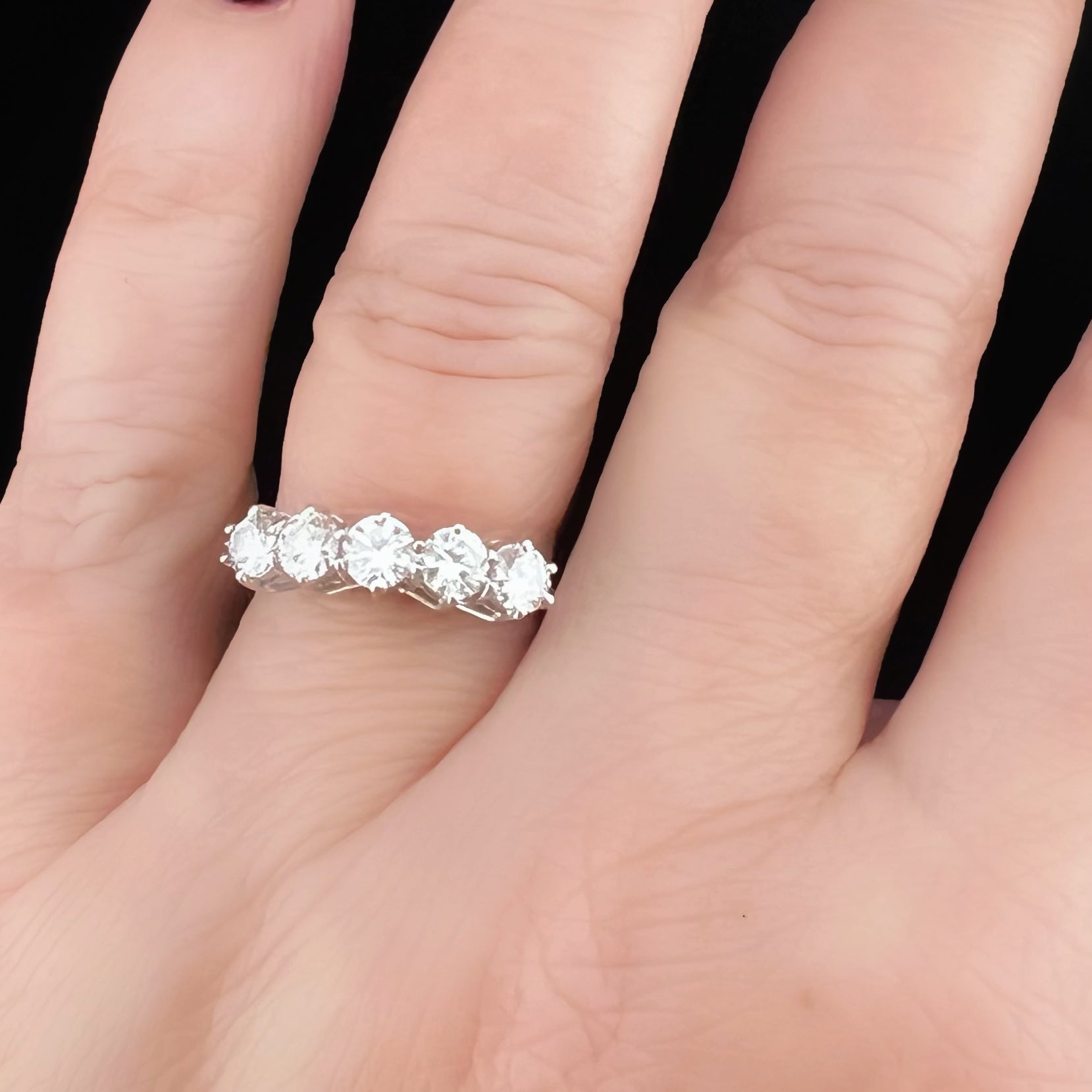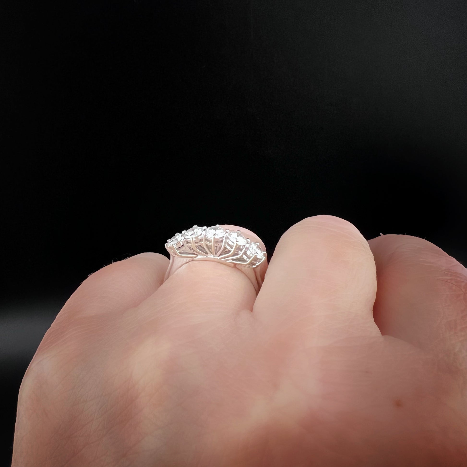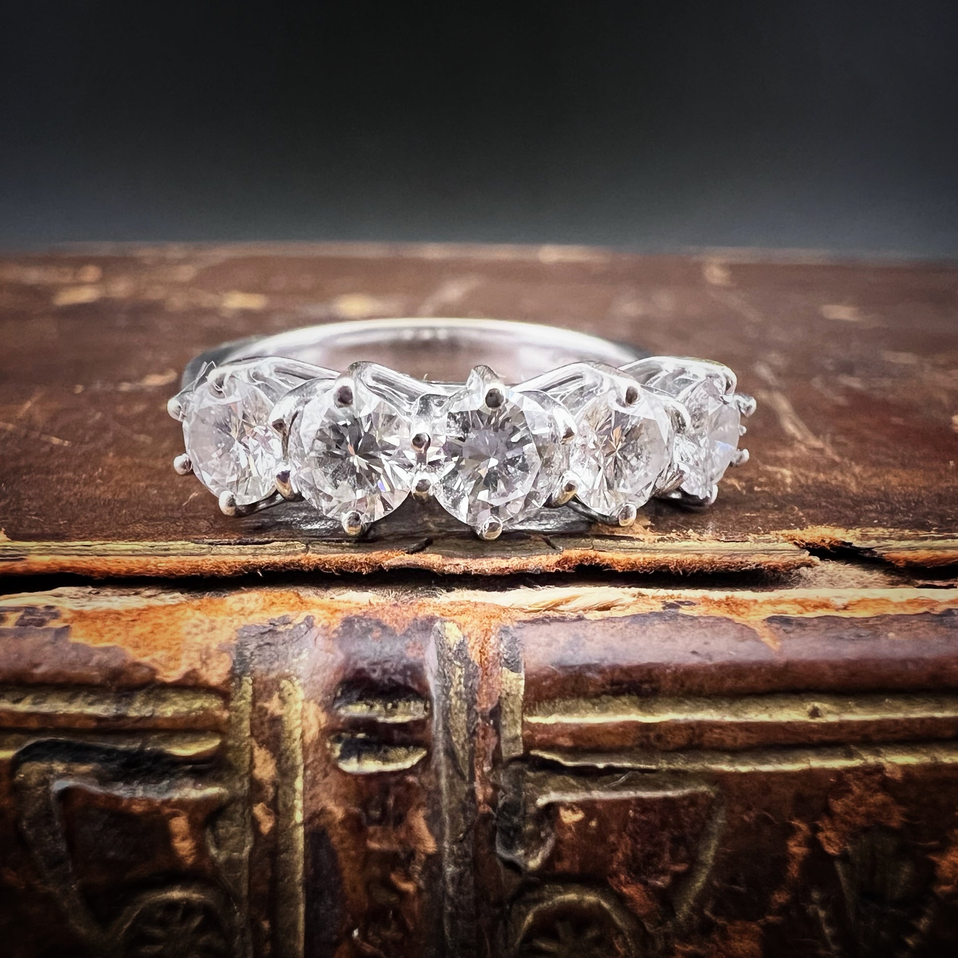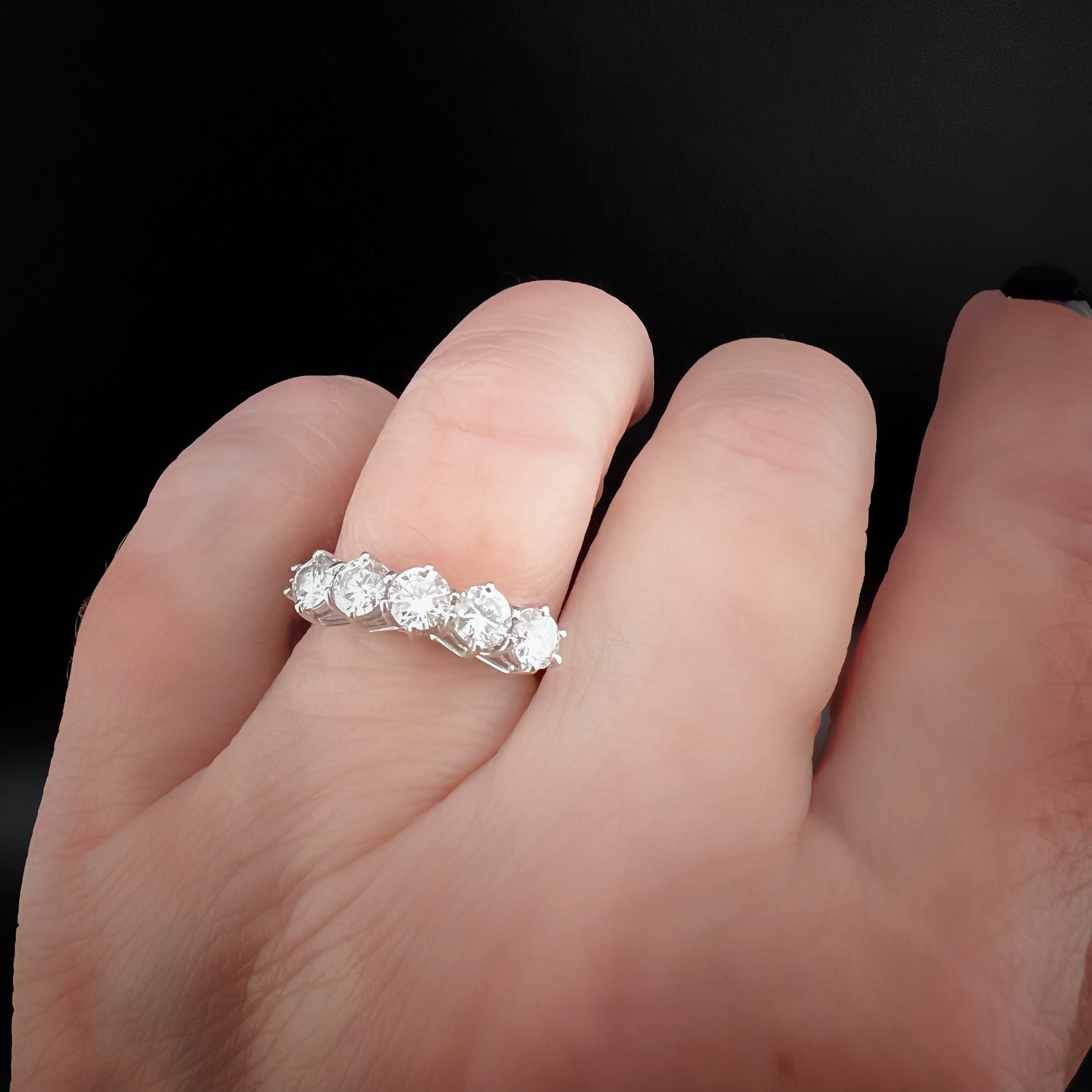 Anello vintage modello “riviere” realizzato in oro bianco 18 carati, dal design classico ed elegante. La struttura a filo è impreziosita da castoni a sei punte, che sostengono cinque diamanti naturali rotondi taglio brillante. La loro caratura complessiva è stimata tra 1.00 e 1.10 carati.