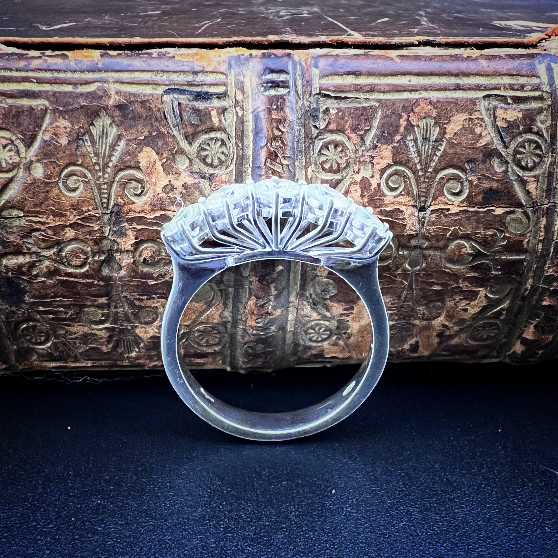 Questi diamanti si distinguono per la purezza elevata (IF/VS) e una colorazione di alta qualità, stimata tra i gradi G e H della scala gemmologica. Il taglio è molto buono, con cinture sottili e smerigliate, che esaltano la brillantezza delle pietre. L’anello pesa complessivamente 4.23 grammi ed è stato lavorato con grande perizia orafa, mantenendosi in condizioni eccellenti.