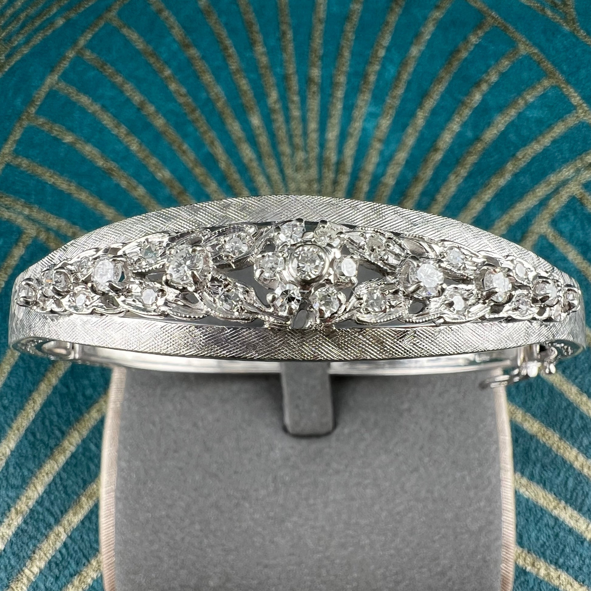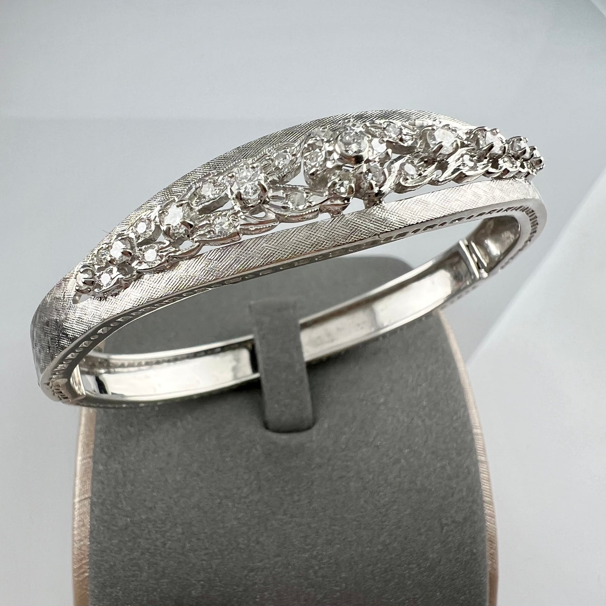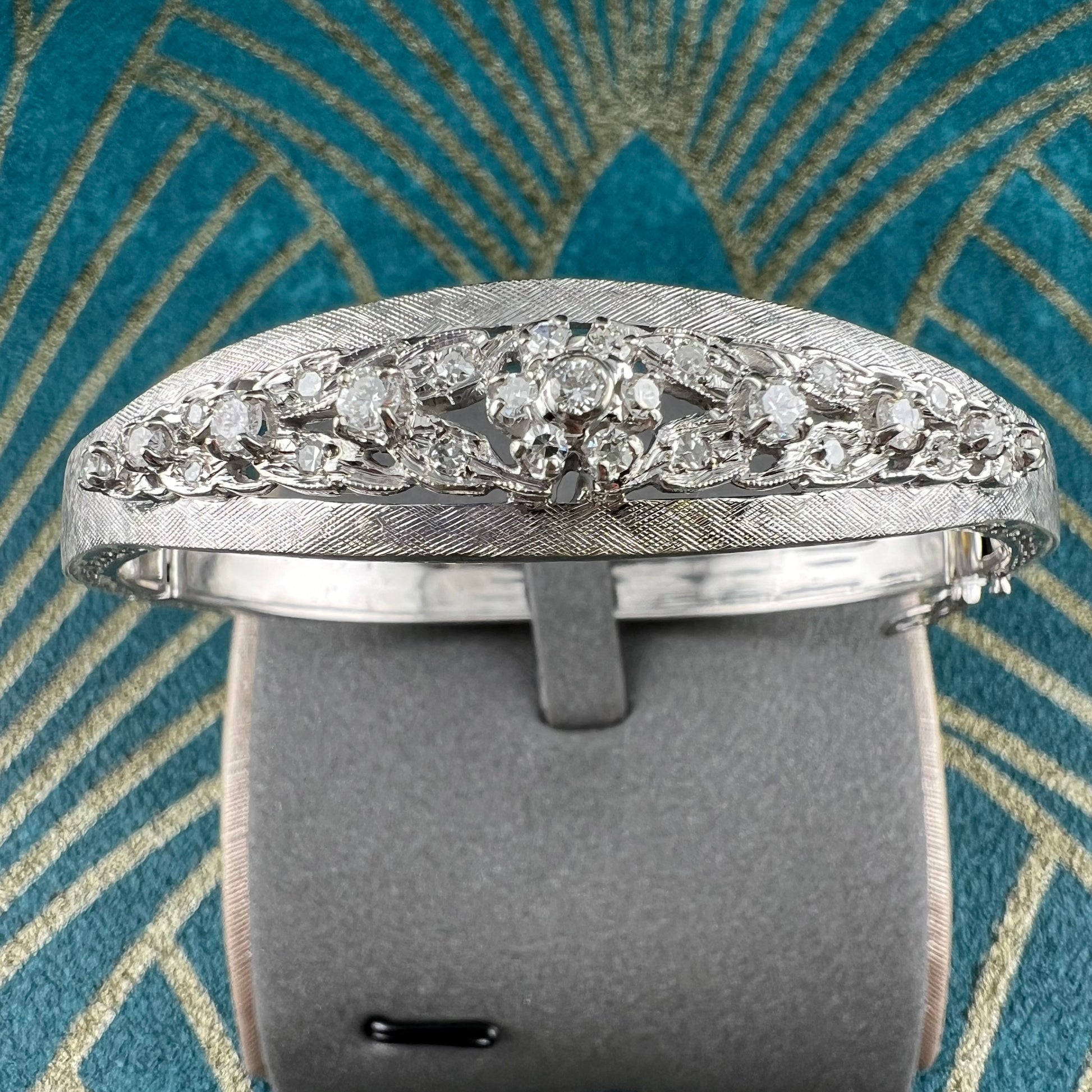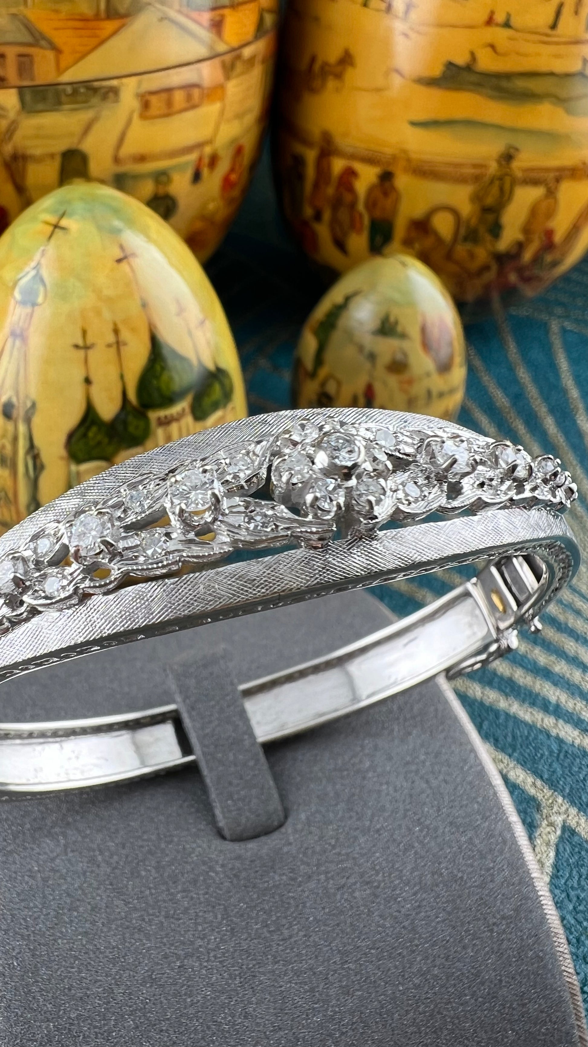 Bracciale vintage risalente agli anni ‘60 del ‘900 con raffinata finitura satinata. La parte anteriore di questo luminosissimo bracciale è riccamente decorata con diamanti a taglio brillante che formano una margherita centrale con foglie ed ornamenti laterali.