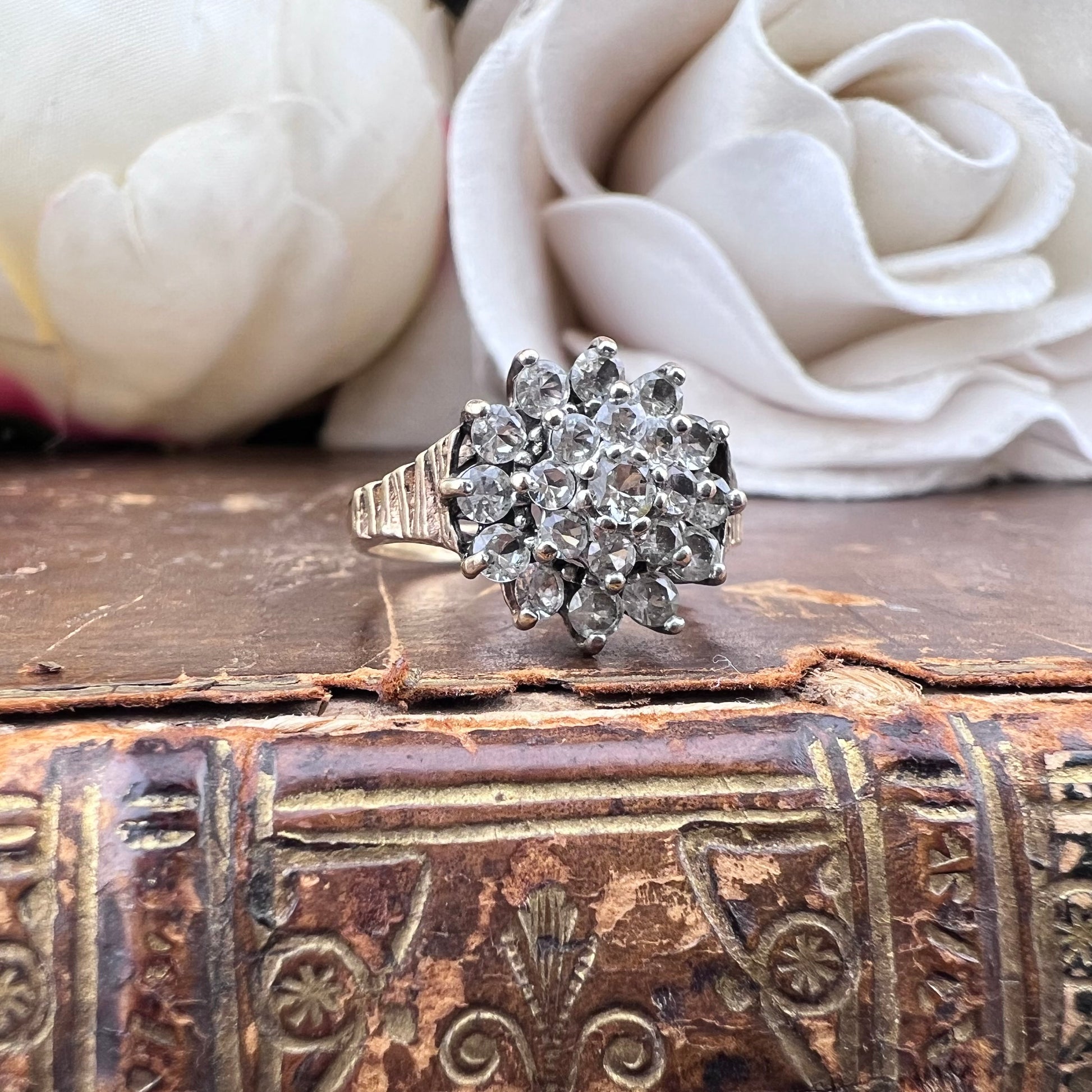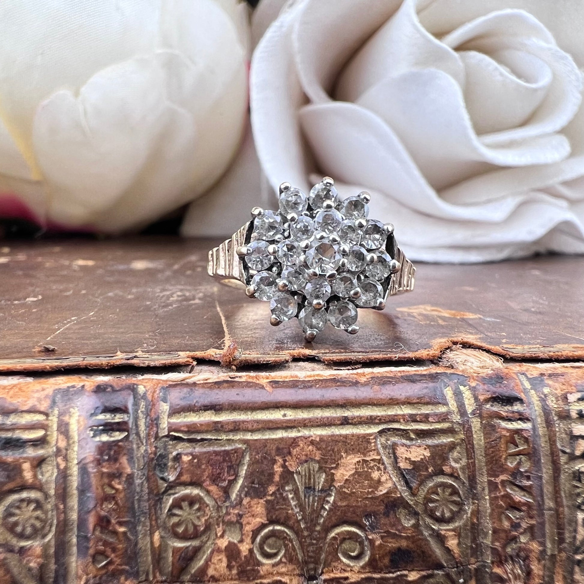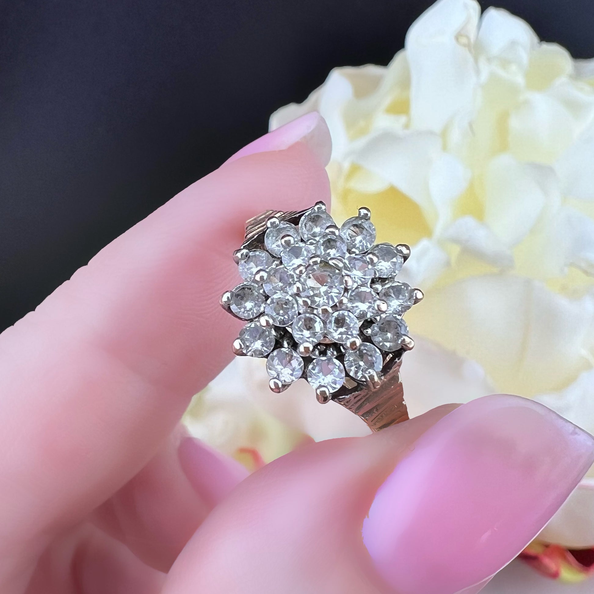 Questo stile, spesso chiamato anche “cluster cocktail ring” o “flower cluster ring”, era comune nei gioielli di moda e engagement alternativi, dove le pietre sono disposte in un arrangiamento circolare o a cupola per massimizzare la brillantezza, ricordando un fiore o un bouquet di gemme. Negli anni ‘70, i cluster ring in oro con pietre chiare erano apprezzati per il loro look glamour e accessibile, influenzato dal design mid-century e dall’estetica retro.