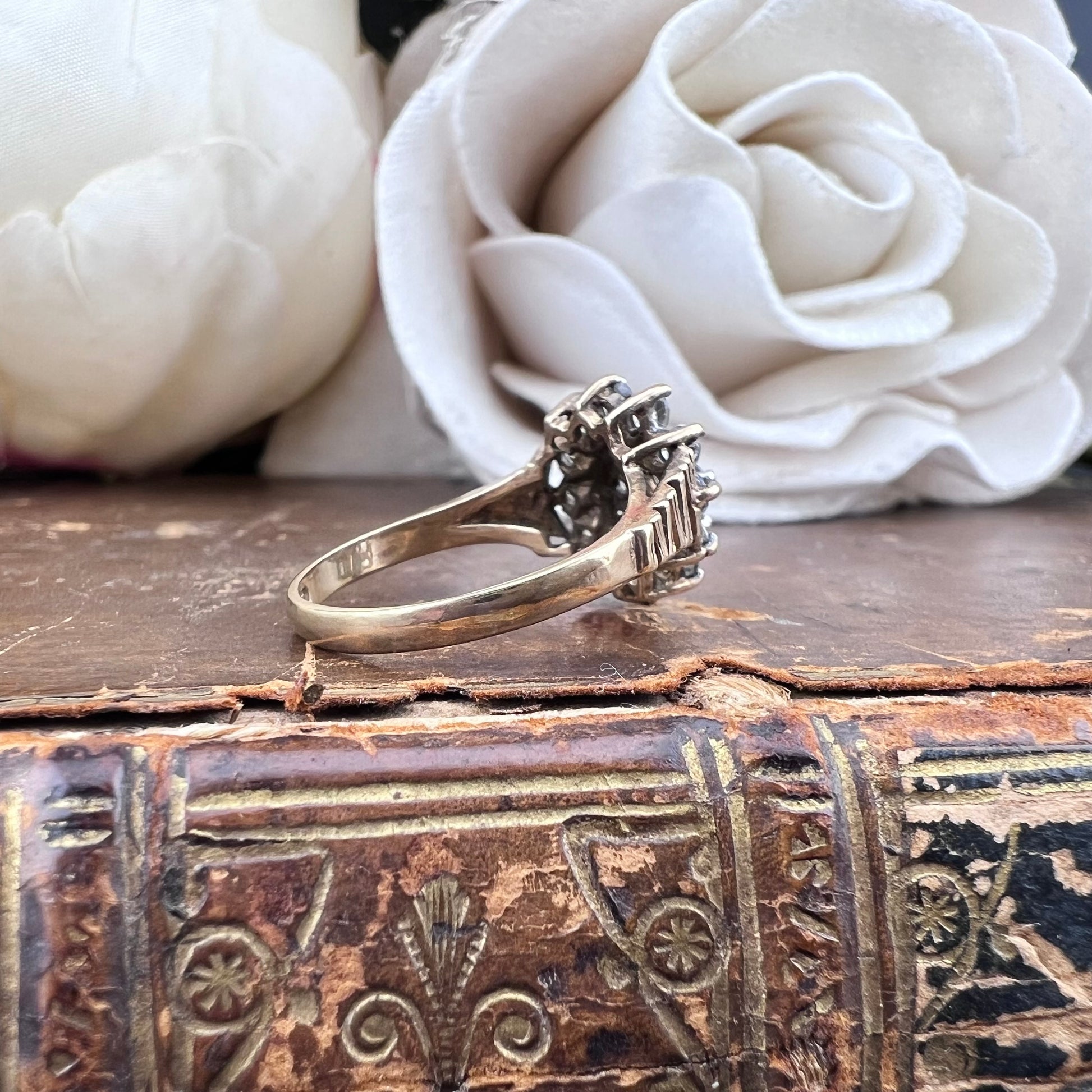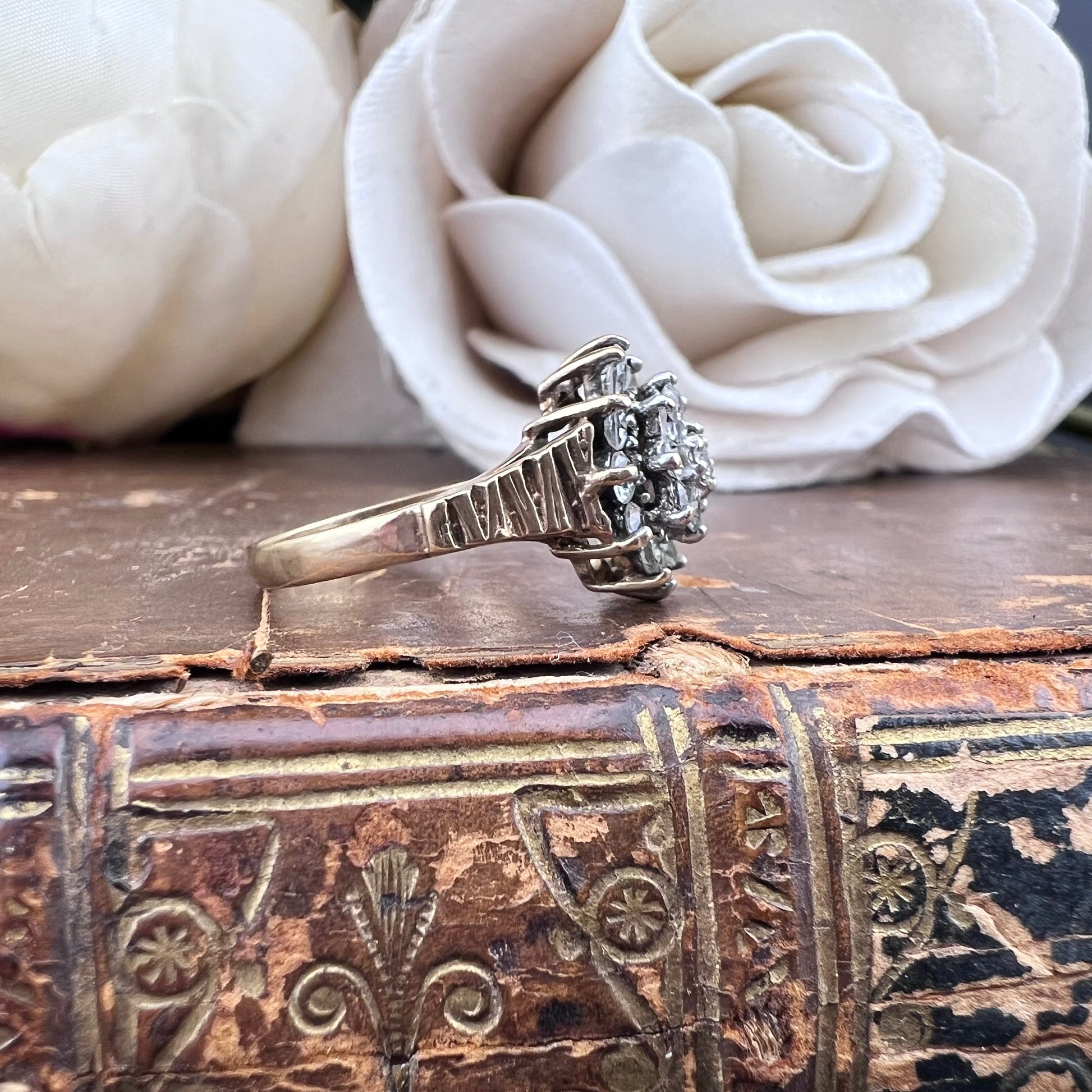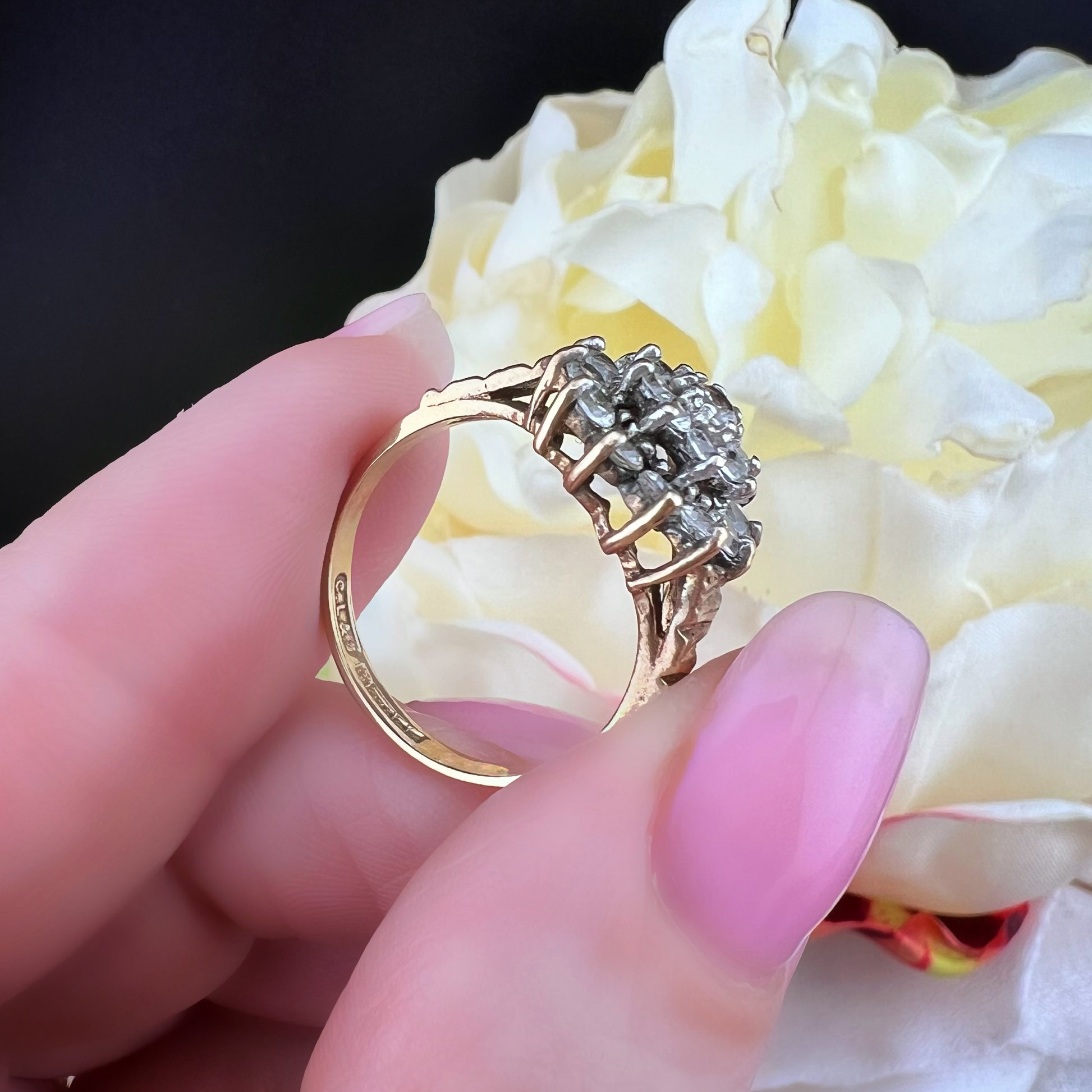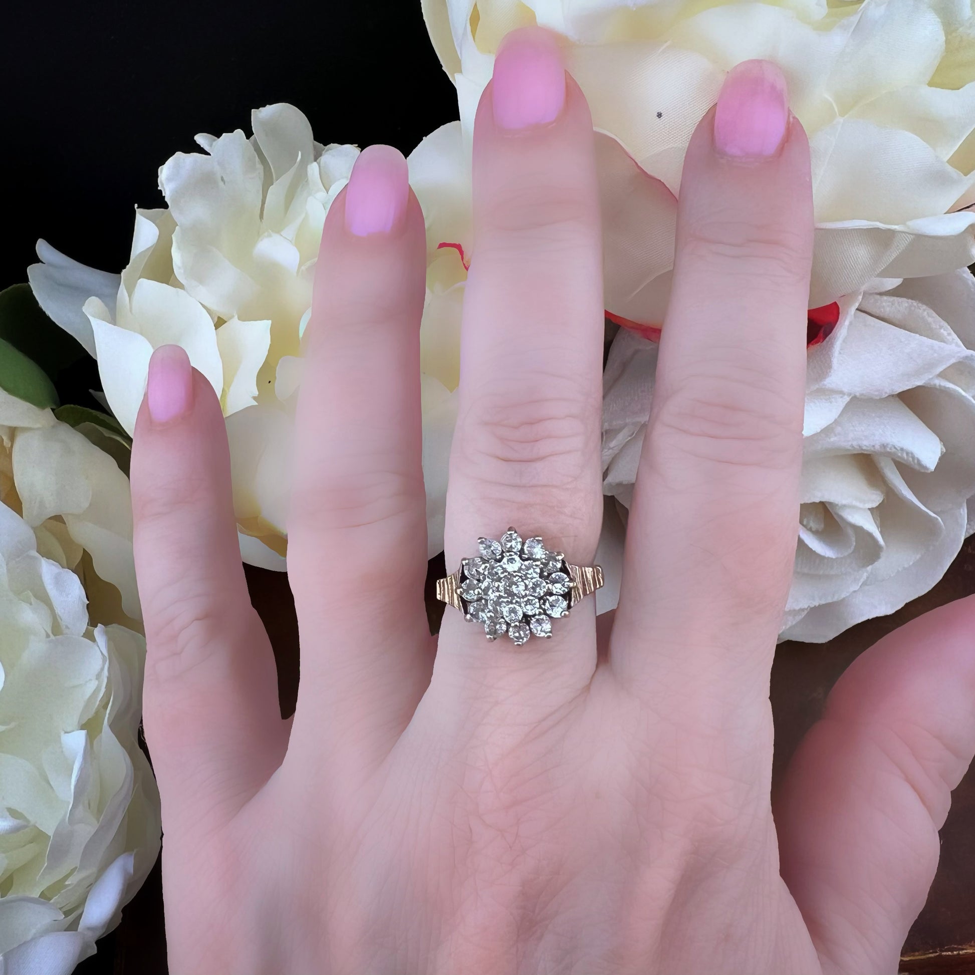 Questo stile, spesso chiamato anche “cluster cocktail ring” o “flower cluster ring”, era comune nei gioielli di moda e engagement alternativi, dove le pietre sono disposte in un arrangiamento circolare o a cupola per massimizzare la brillantezza, ricordando un fiore o un bouquet di gemme. Negli anni ‘70, i cluster ring in oro con pietre chiare erano apprezzati per il loro look glamour e accessibile, influenzato dal design mid-century e dall’estetica retro.