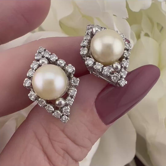 Questi splendidi orecchini sono realizzati in oro bianco 18 ct e presentano un elaborato cestello a forma di losanga, impreziosito sul bordo da una raffinata incastonatura di 18 diamanti ciascuno, per un totale di 36 gemme dal taglio brillante (peso complessivo stimato 0.36 ct). Al centro, protagoniste assolute, troviamo due perle naturali coltivate di circa 8 mm, dalla buona perlagione, luminose e armoniose nella forma.