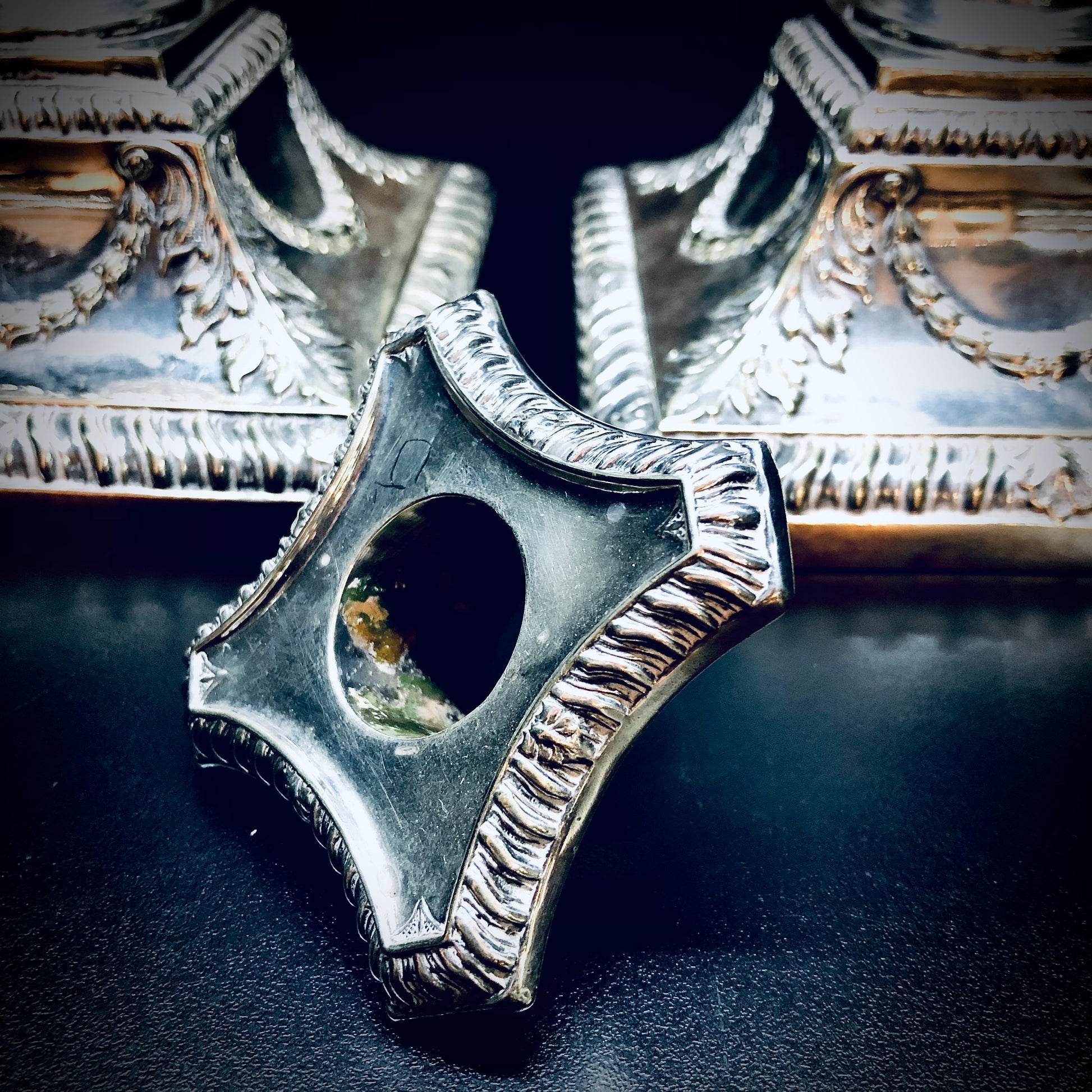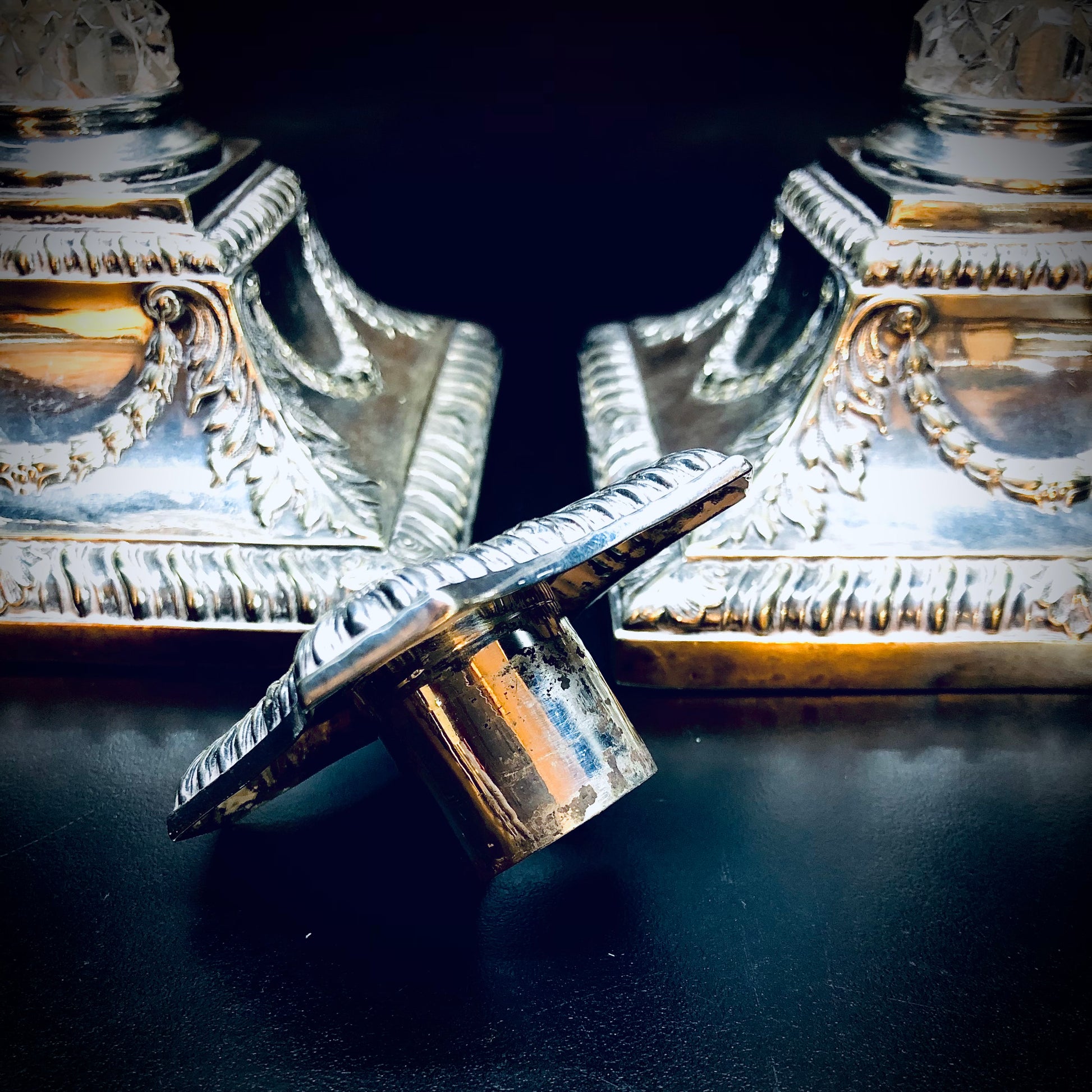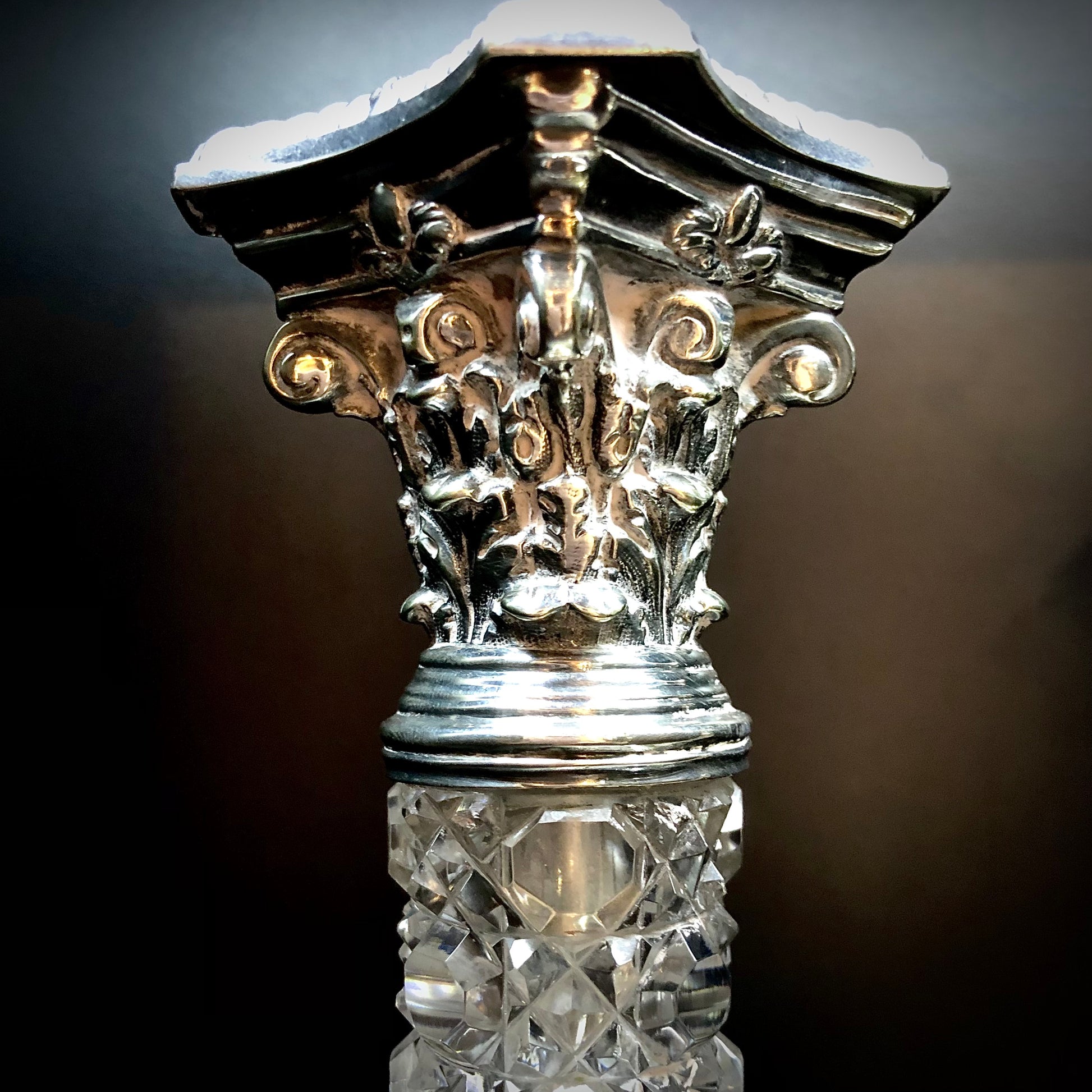 Particolari ed inusuali candelieri con fusto in cristallo molato. Basi, capitelli e bobech (removibili) in Sheffield plate. Le decorazioni in stile neoclassico dei classici candelieri a colonna vengono alleggerite dalla trasparenza dei cristalli. Realizzati in Inghilterra alla fine dell’’800.
