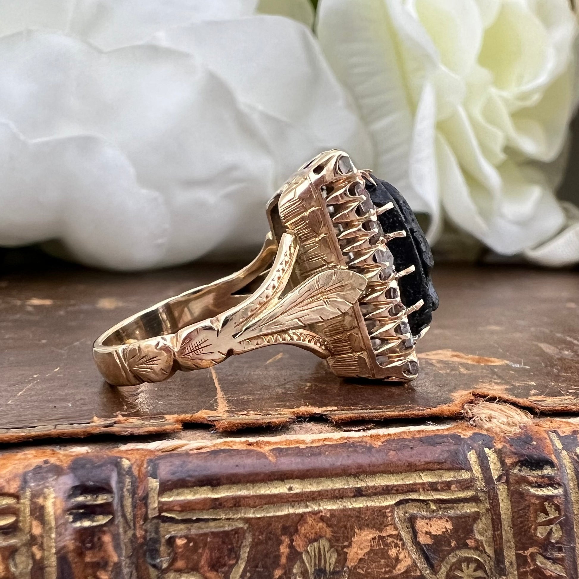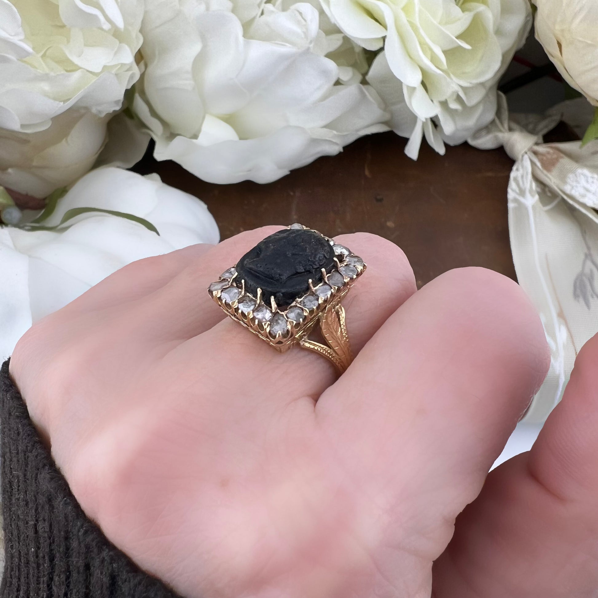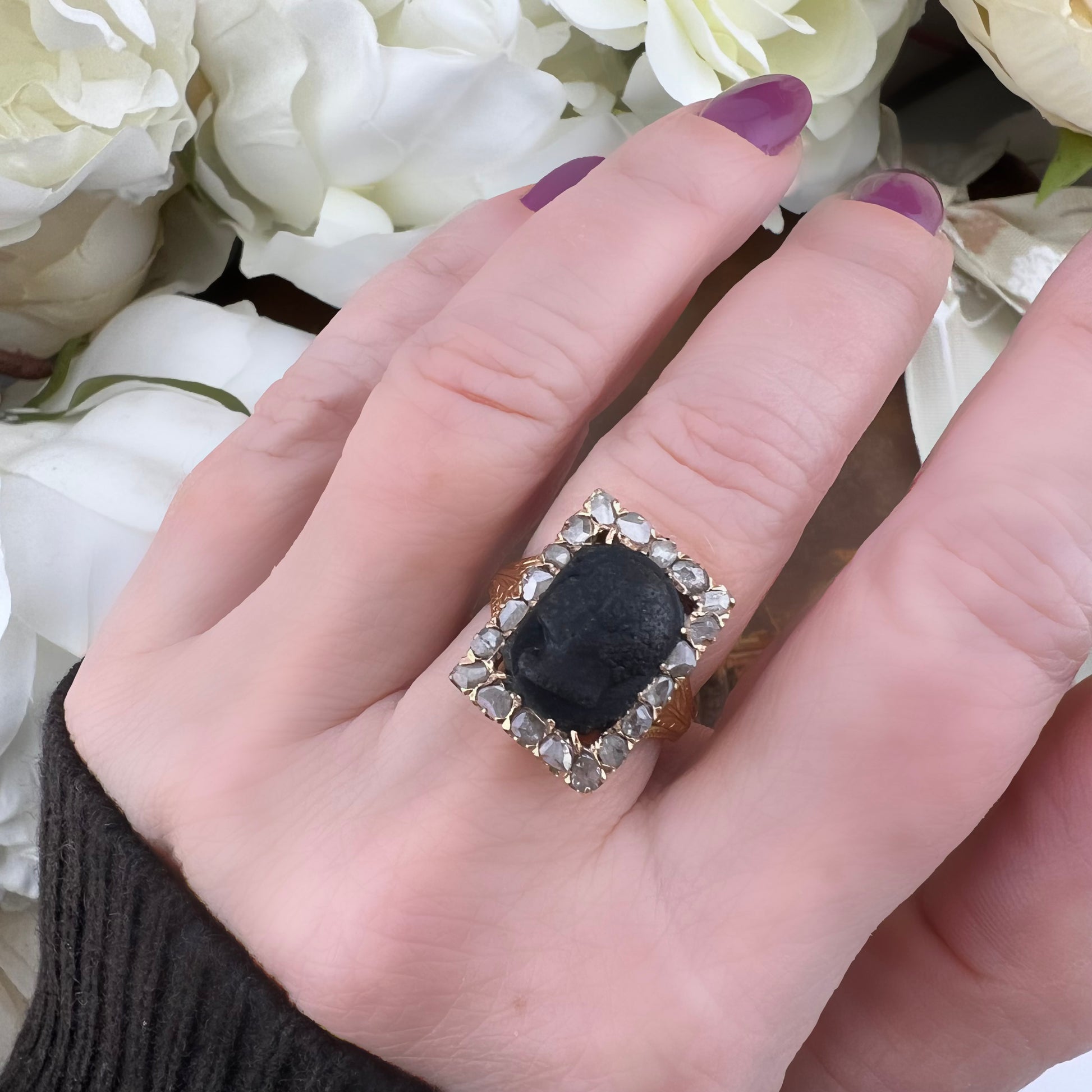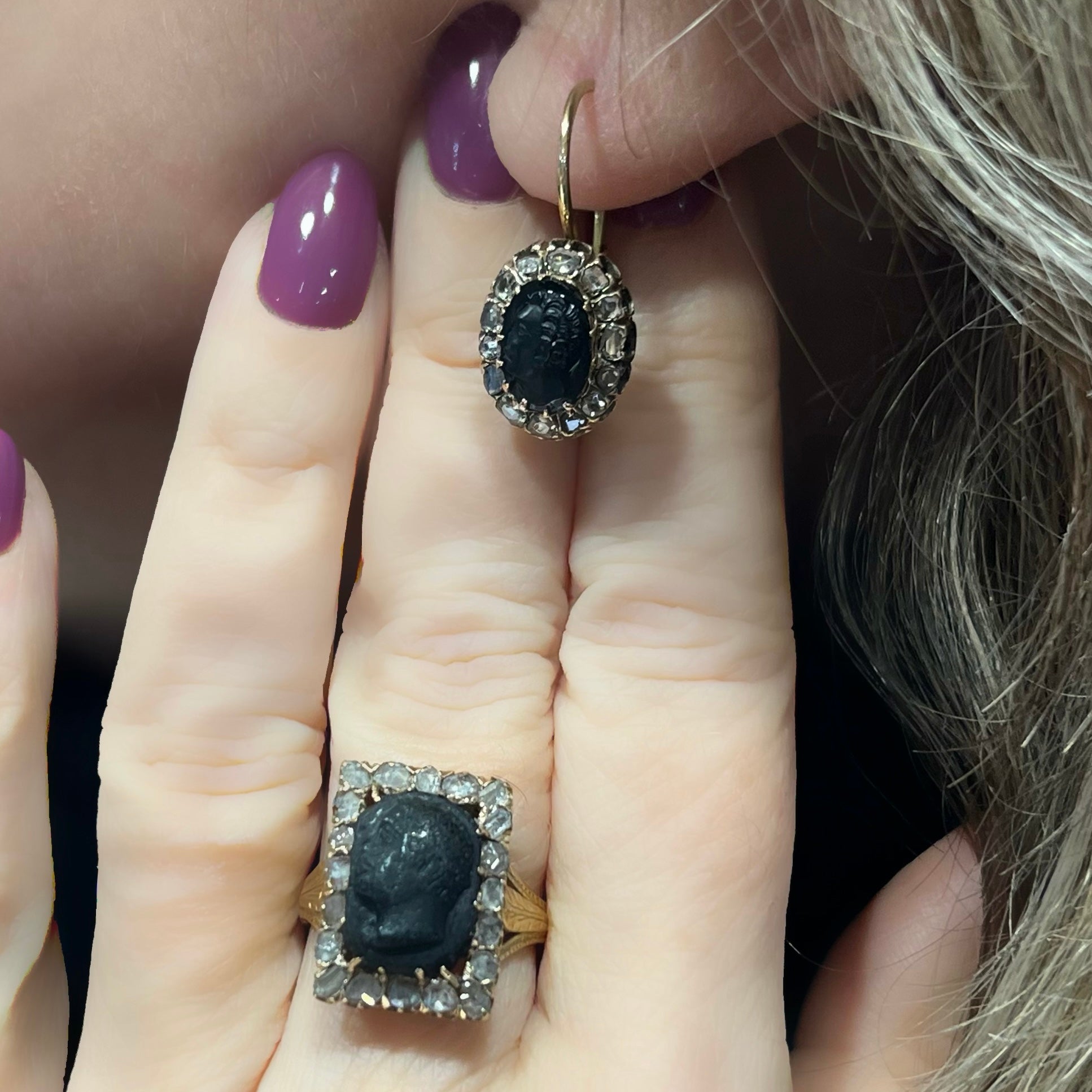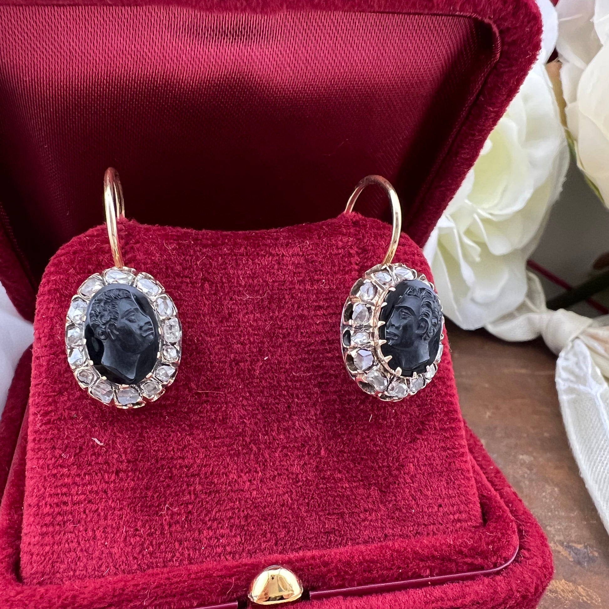 I Moretti sono incorniciati da diamanti a taglio rosetta, incastonati singolarmente in montature chiuse, secondo il gusto dell’epoca. Il taglio antico conferisce una luminosità morbida e vibrante, perfettamente coerente con l’estetica ottocentesca e di grande fascino per i collezionisti.