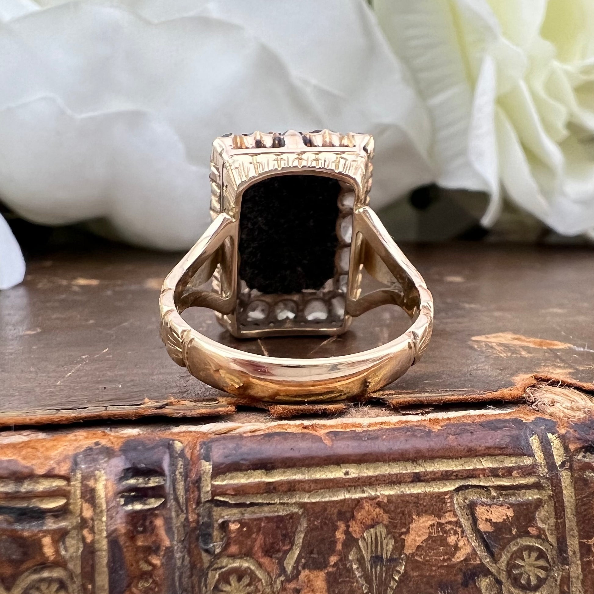 L’anello si distingue per una struttura particolarmente elaborata e architettonica, con castone riccamente decorato e spallette finemente lavorate, impreziosite da incisioni minute e perfettamente conservate. La cura dei dettagli anche nelle parti meno visibili testimonia una manifattura di alto livello, destinata a una committenza colta e raffinata.
