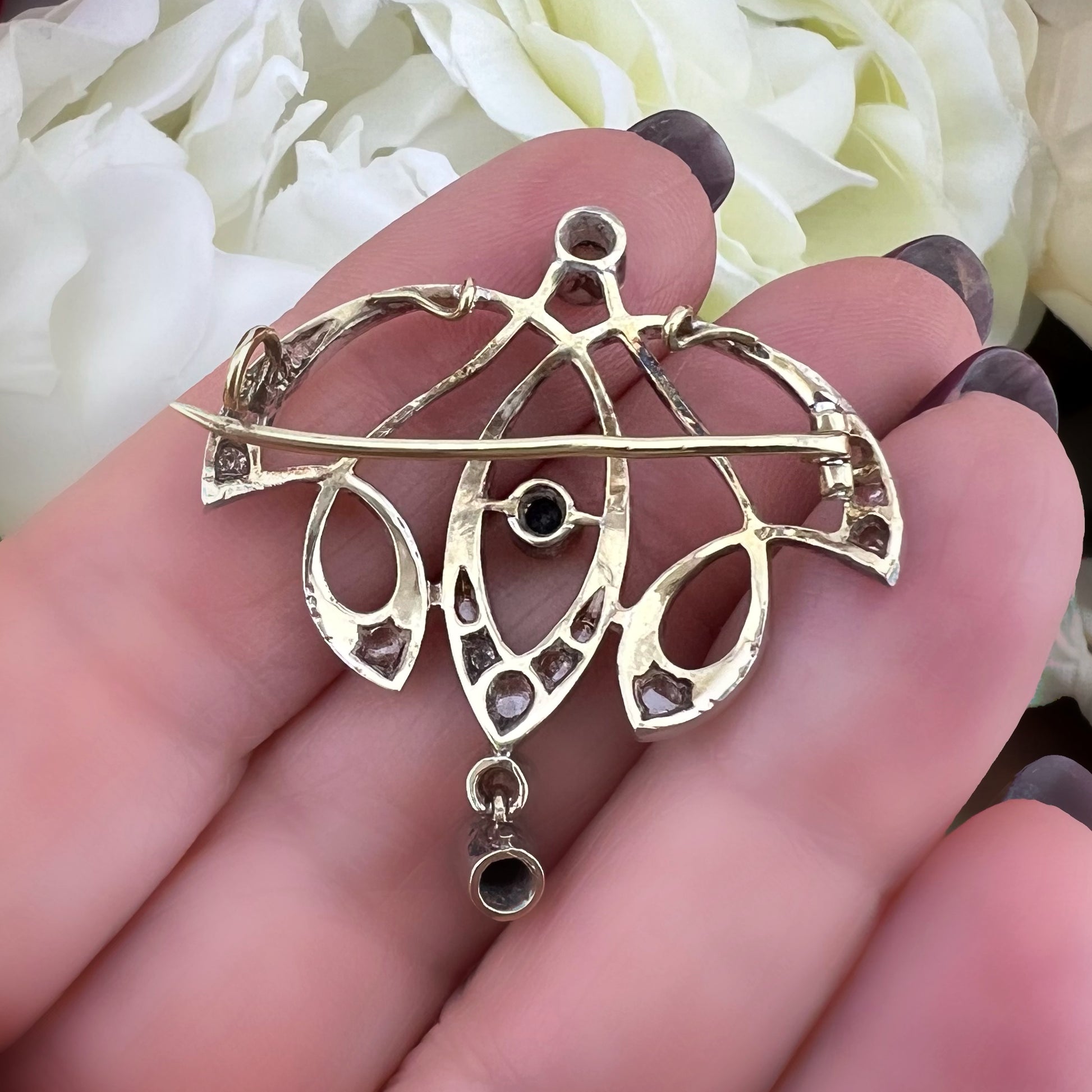 Elegante spilla/pendente Art Nouveau realizzata in oro giallo 18 carati, con la parte superiore foderata in argento, secondo la raffinata tradizione orafa antecedente all’introduzione dell’oro bianco.