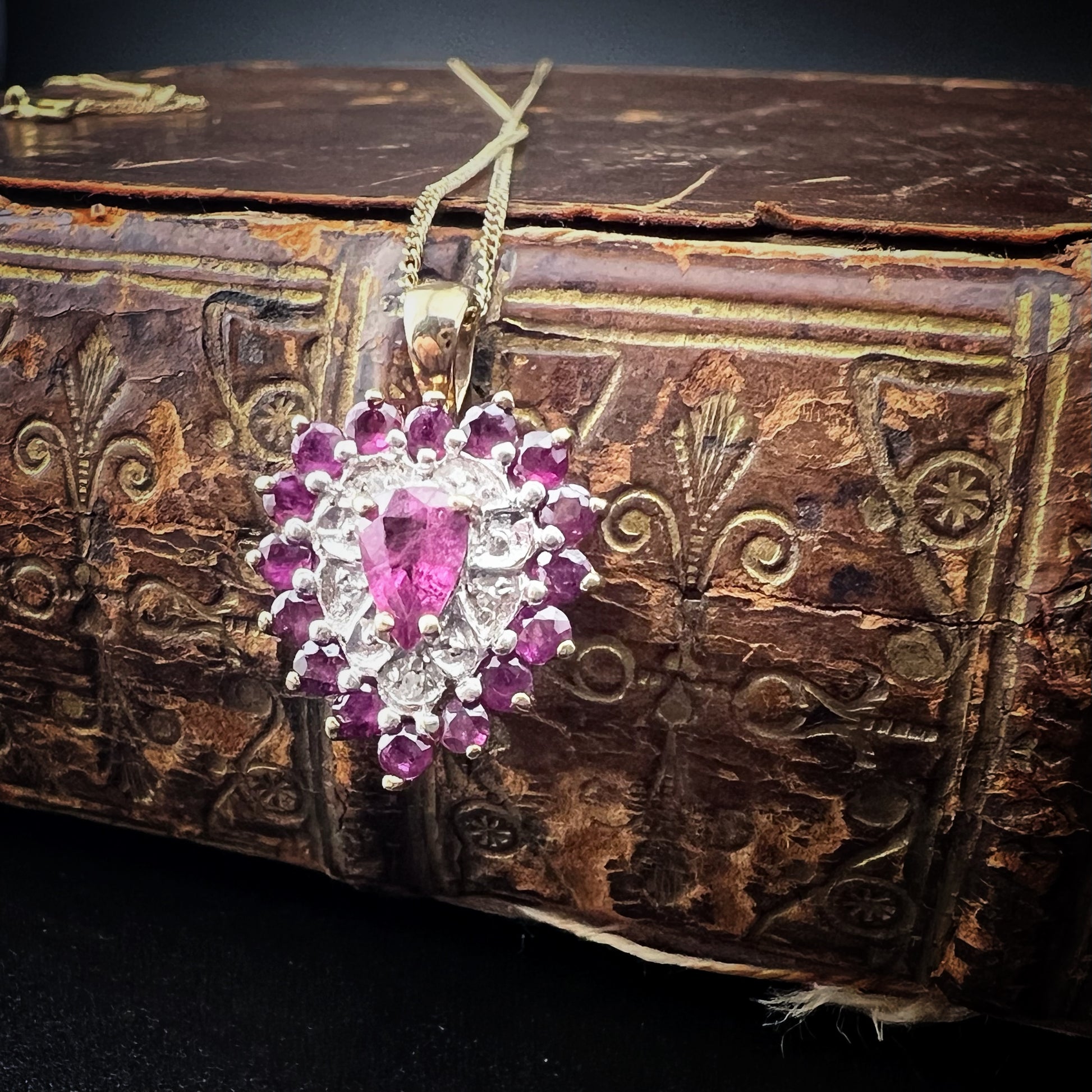 Realizzato in oro giallo 9 carati, il cuore è impreziosito da un incantevole rubino centrale a goccia, simbolo di passione e nobiltà.