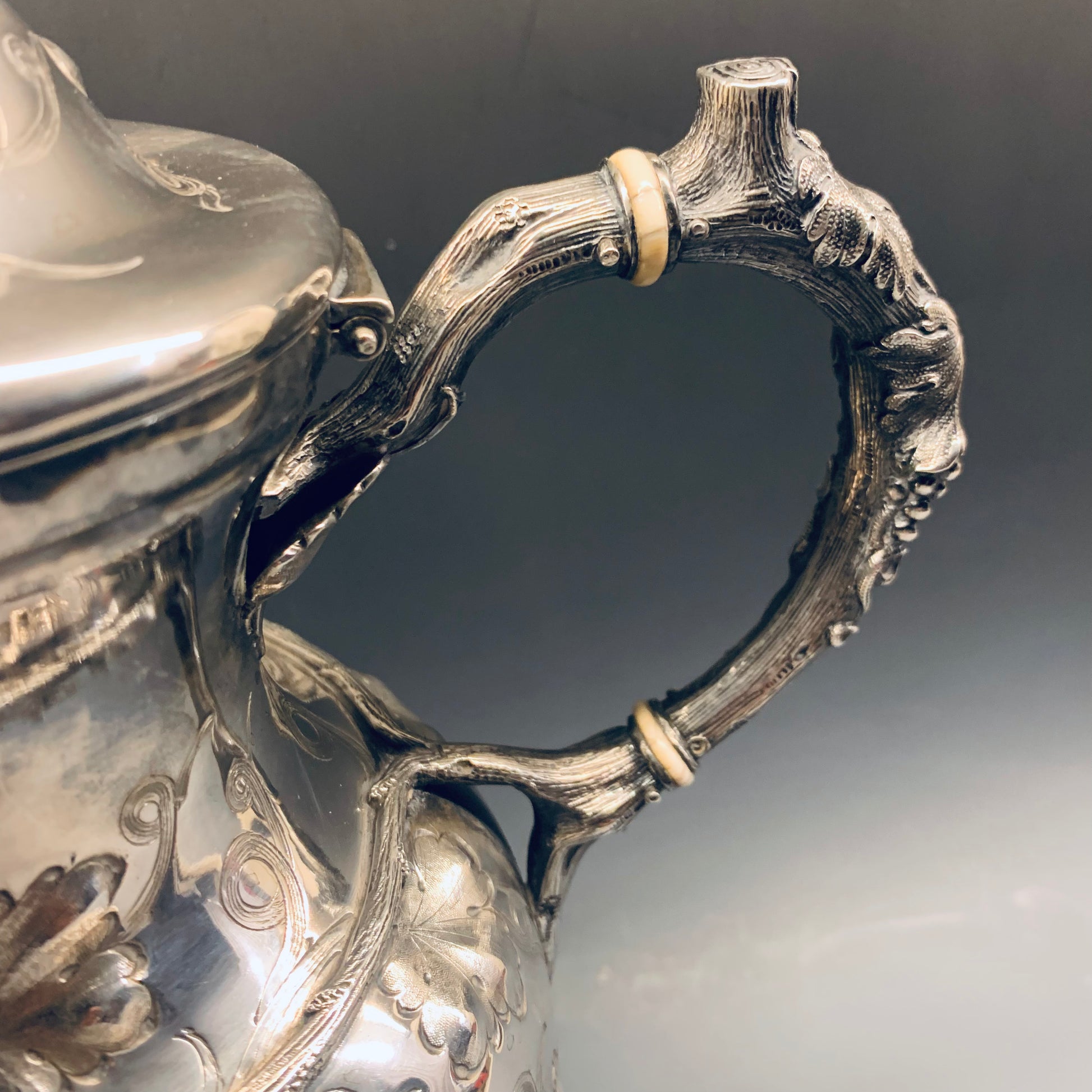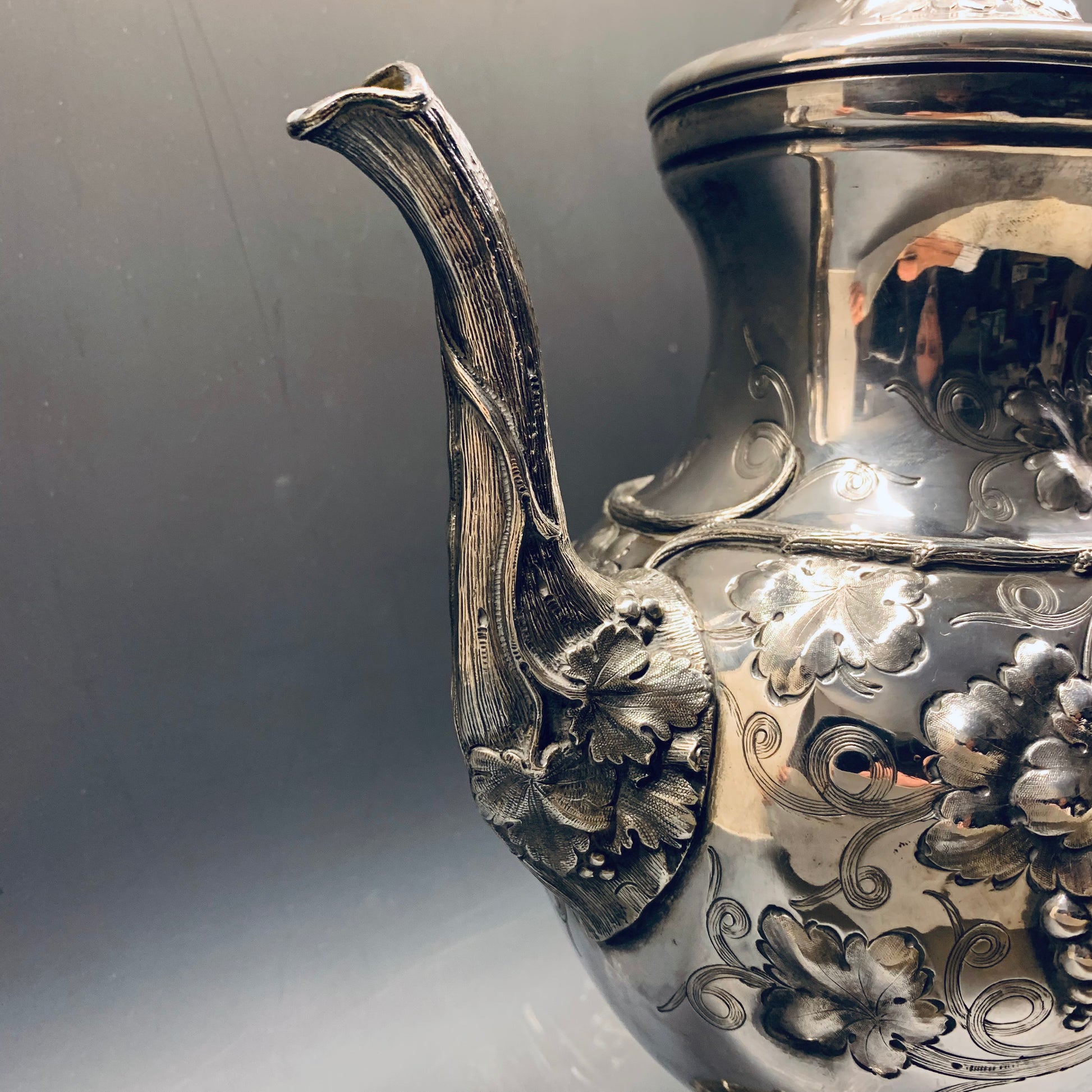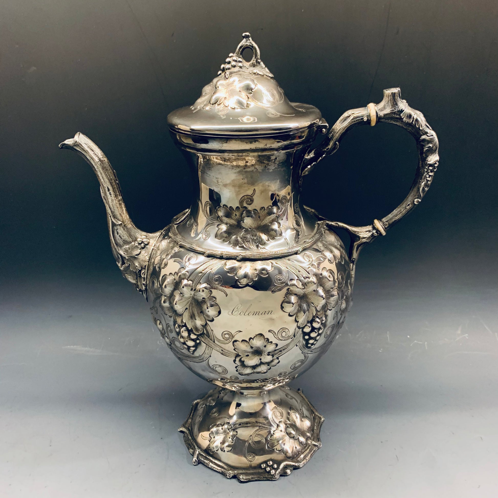 Questa rara ed imponente caffettiera in argento di titolo COIN risale al 1850 ed è stata creata a New York. Realizzata in argento silver coin, merita di essere esposta come opera d'arte. Ornata con decorazioni su tutta la superficie, può anche essere utilizzata per portare in tavola un tocco di lusso. Rara caffettiera newyorkese della metà dell’Ottocento, realizzata in argento di titolo COIN, ovvero lo standard del titolo del conio del dollaro pari a 900/1000.