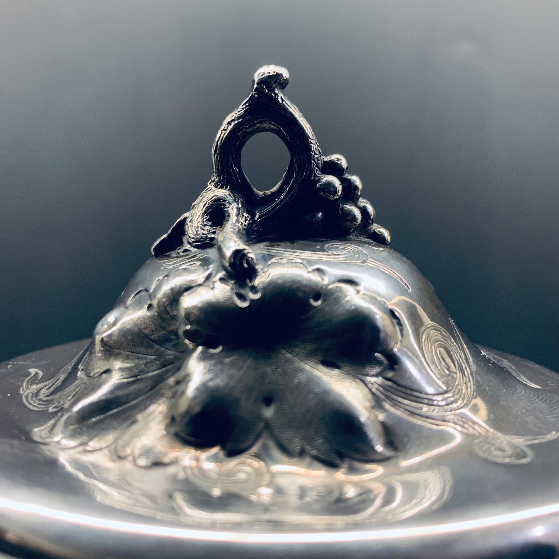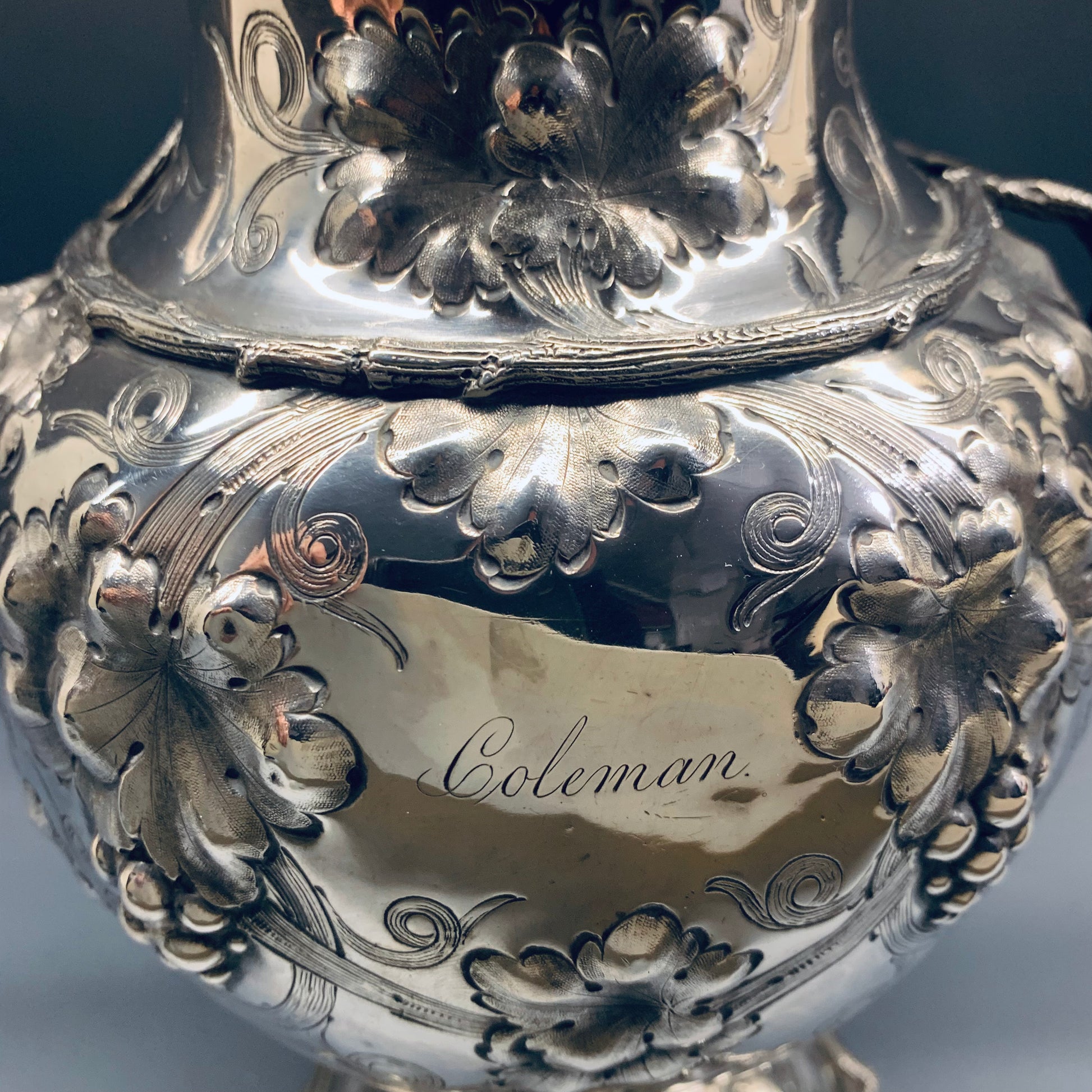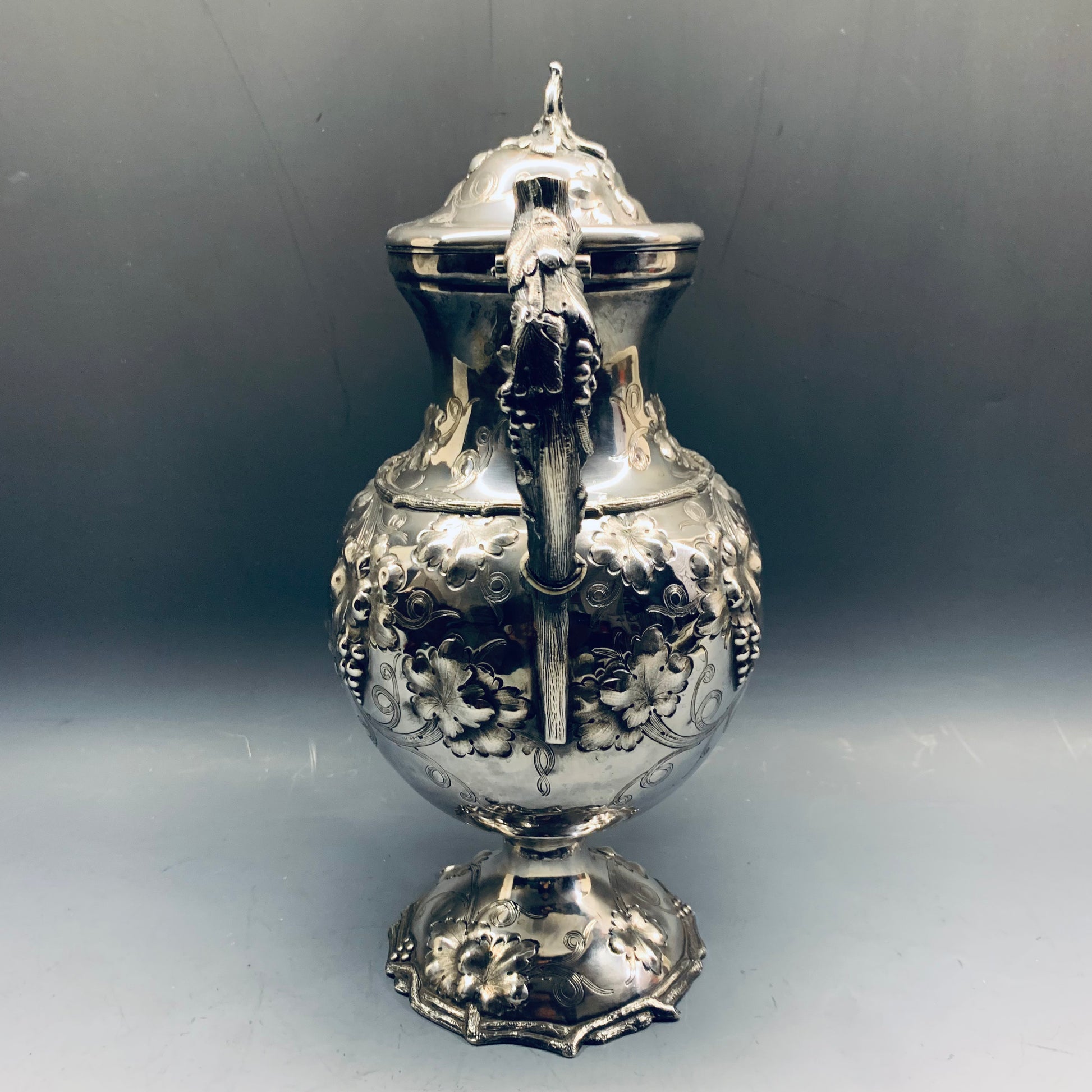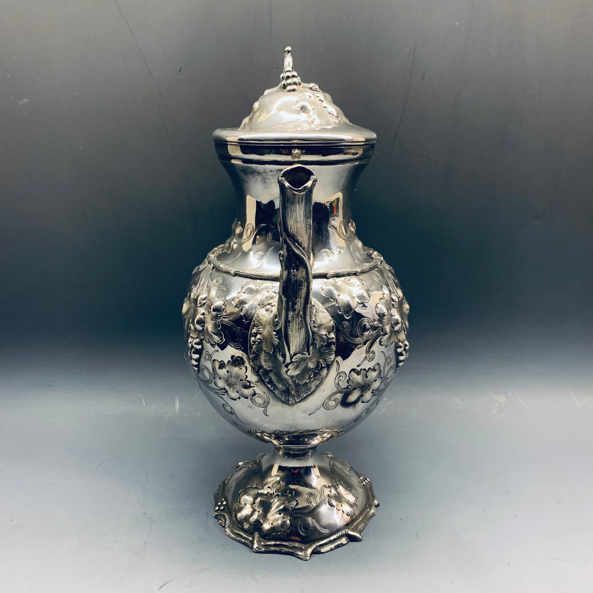 Questa rara ed imponente caffettiera in argento di titolo COIN risale al 1850 ed è stata creata a New York. Realizzata in argento silver coin, merita di essere esposta come opera d'arte. Ornata con decorazioni su tutta la superficie, può anche essere utilizzata per portare in tavola un tocco di lusso. Rara caffettiera newyorkese della metà dell’Ottocento, realizzata in argento di titolo COIN, ovvero lo standard del titolo del conio del dollaro pari a 900/1000.