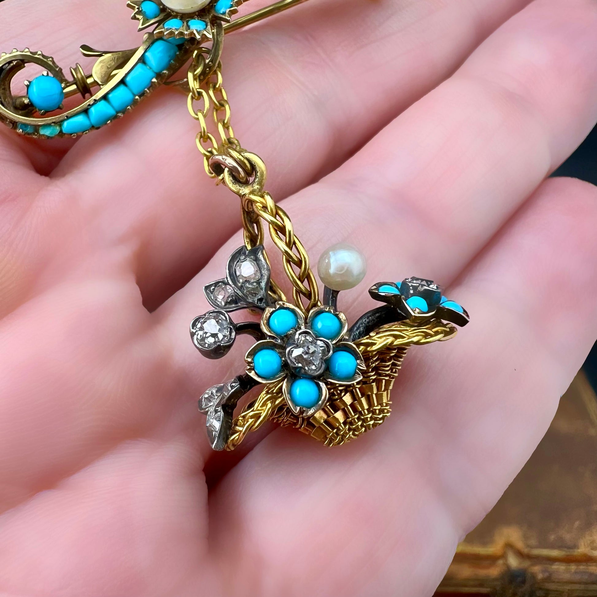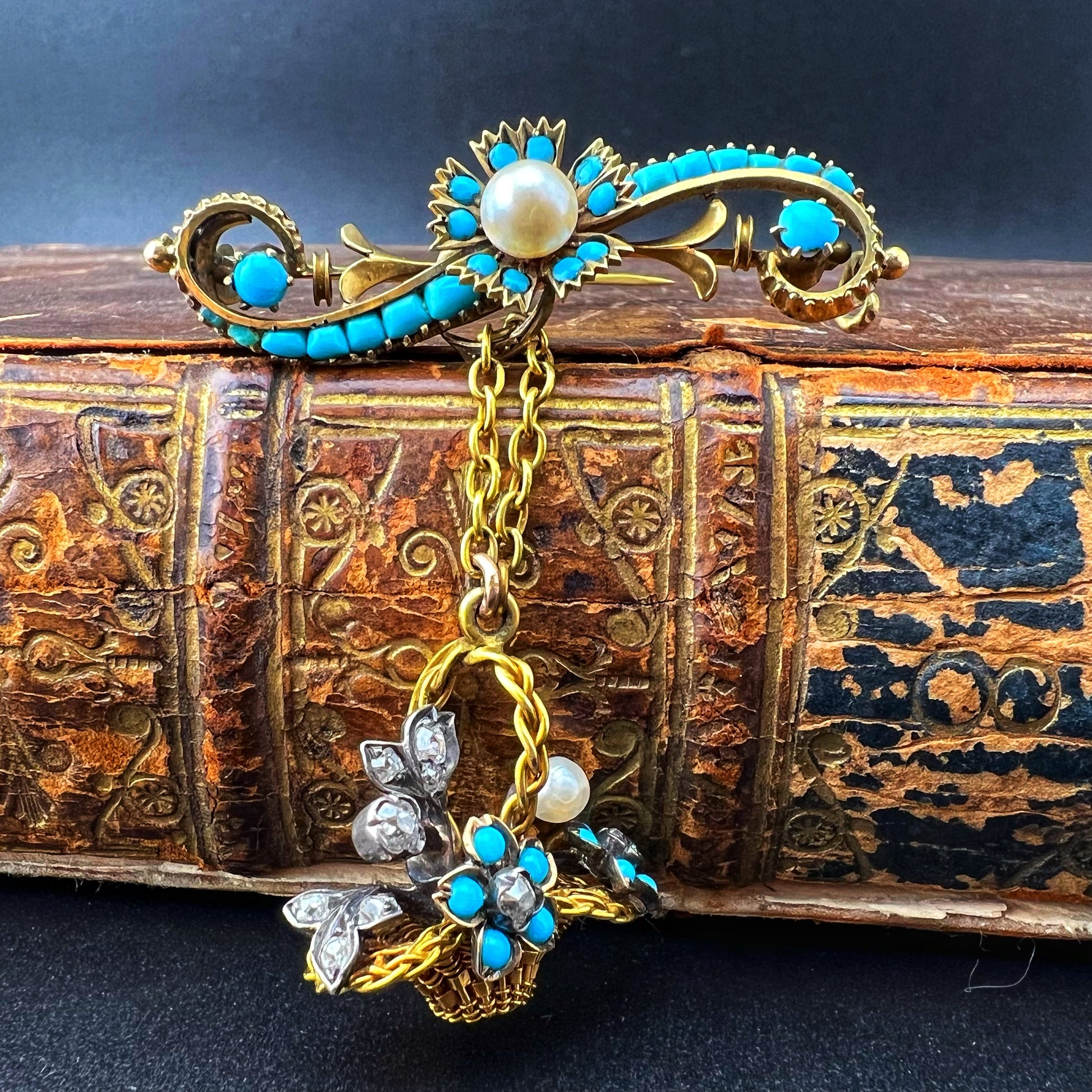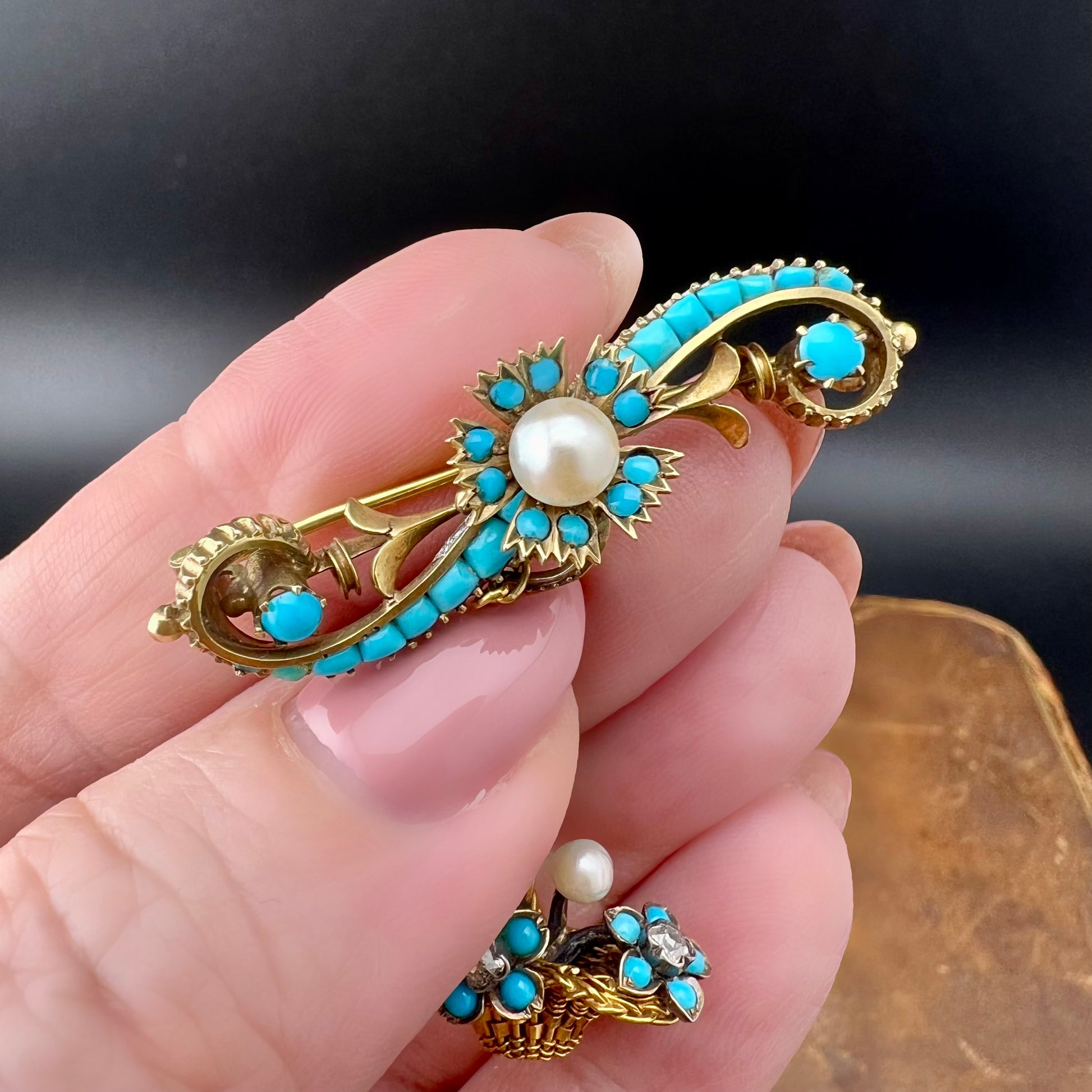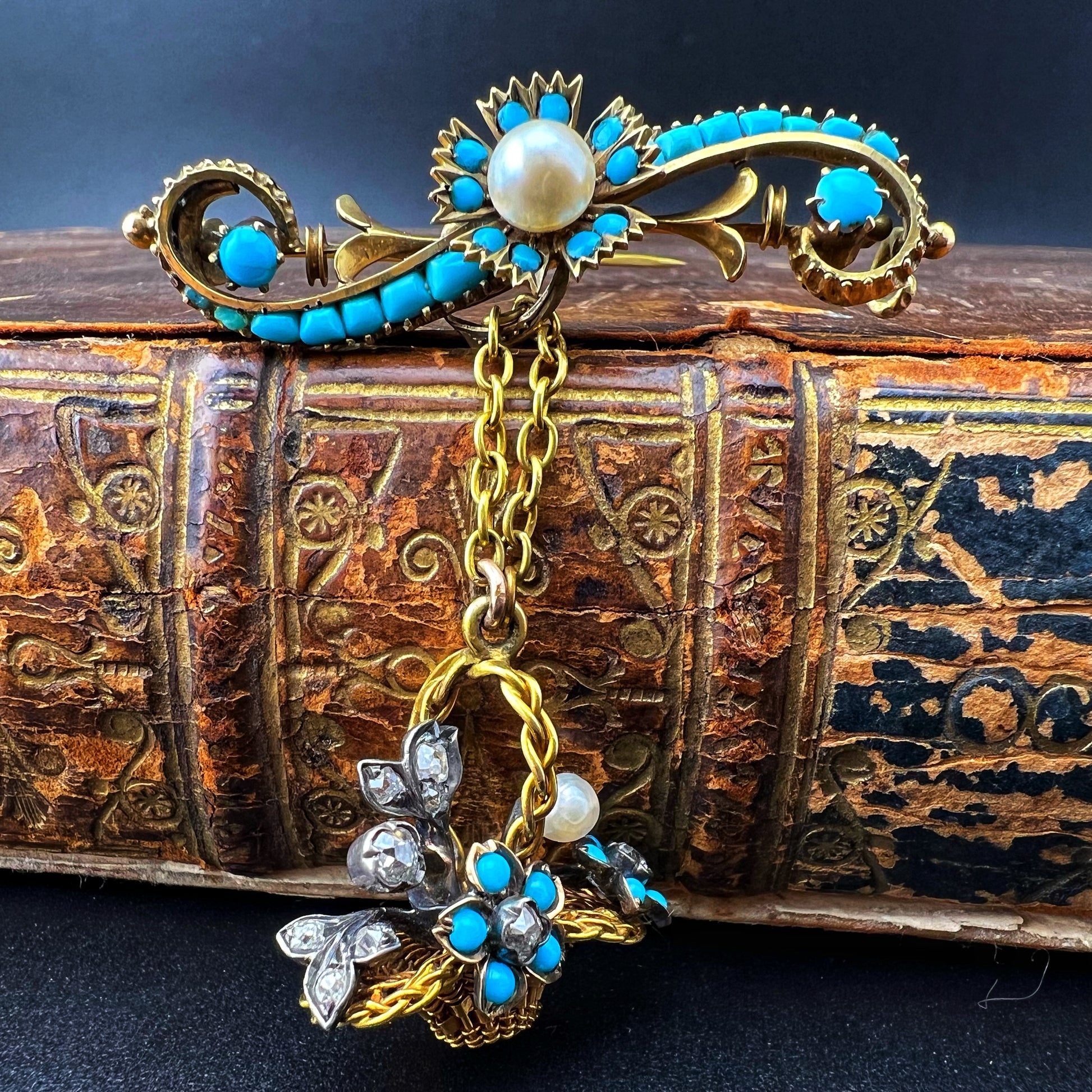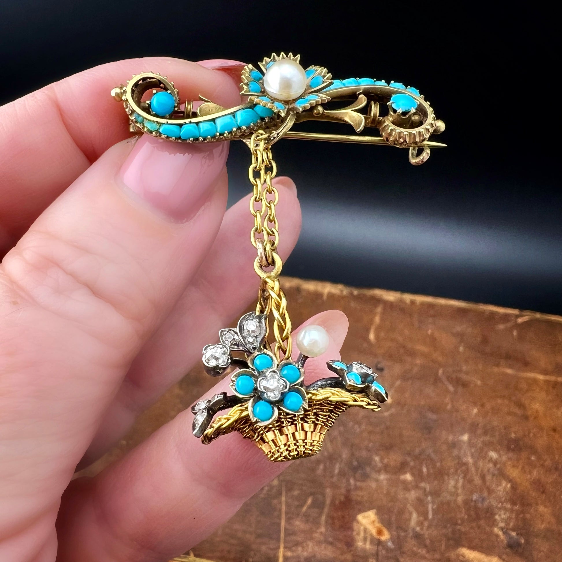 Spilla Antica in Oro Giallo 18 e 12 Ct con Turchesi, Perle e Diamanti – Raffinato Design con Cestello a Sospensione